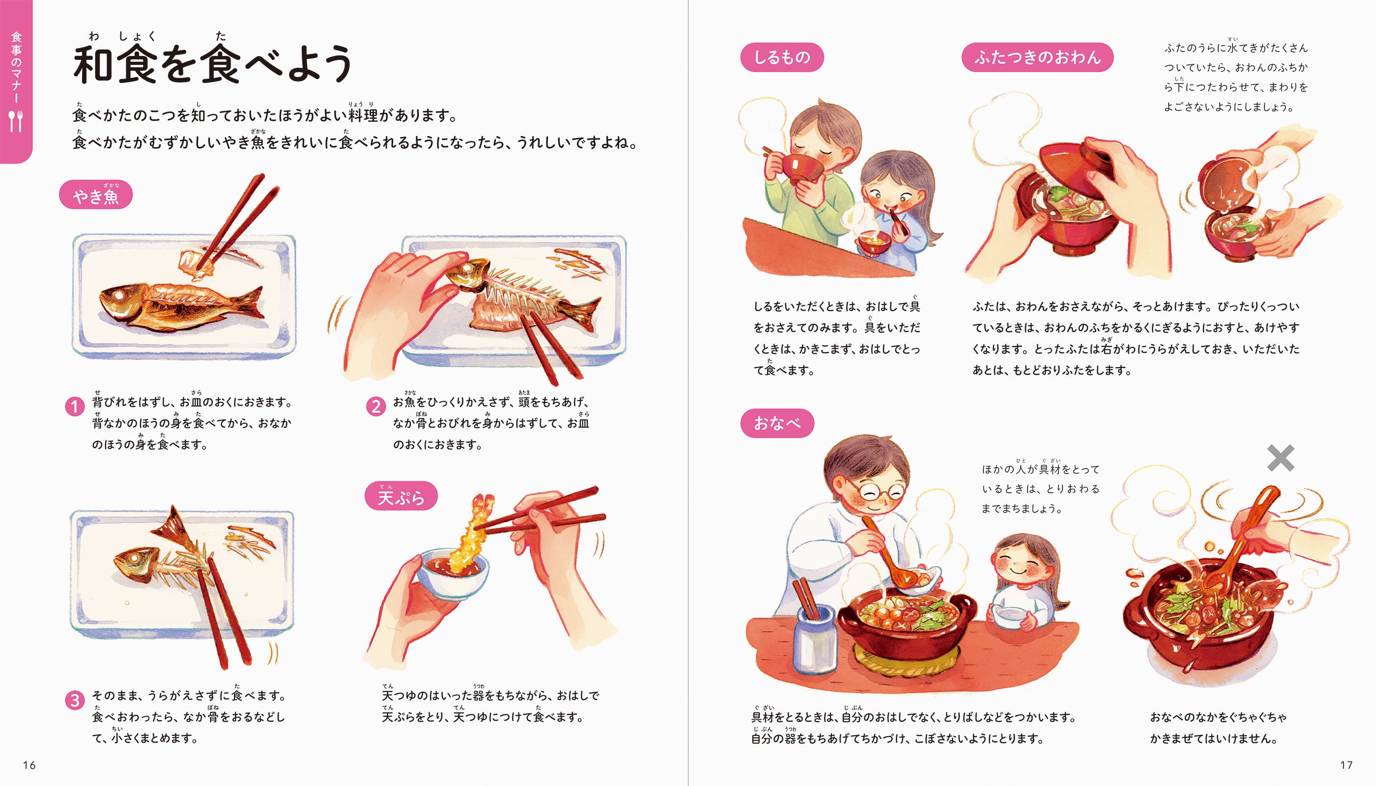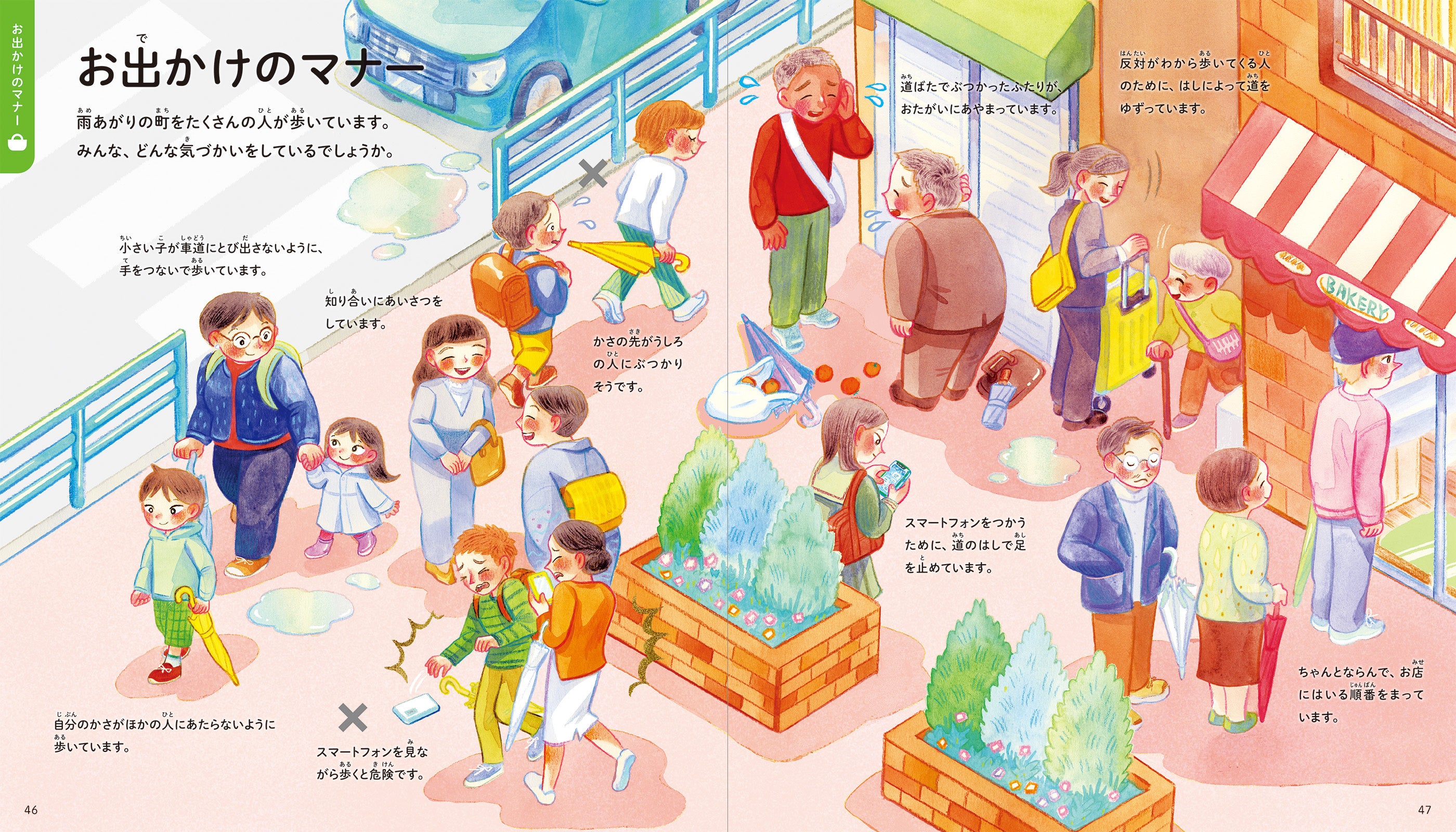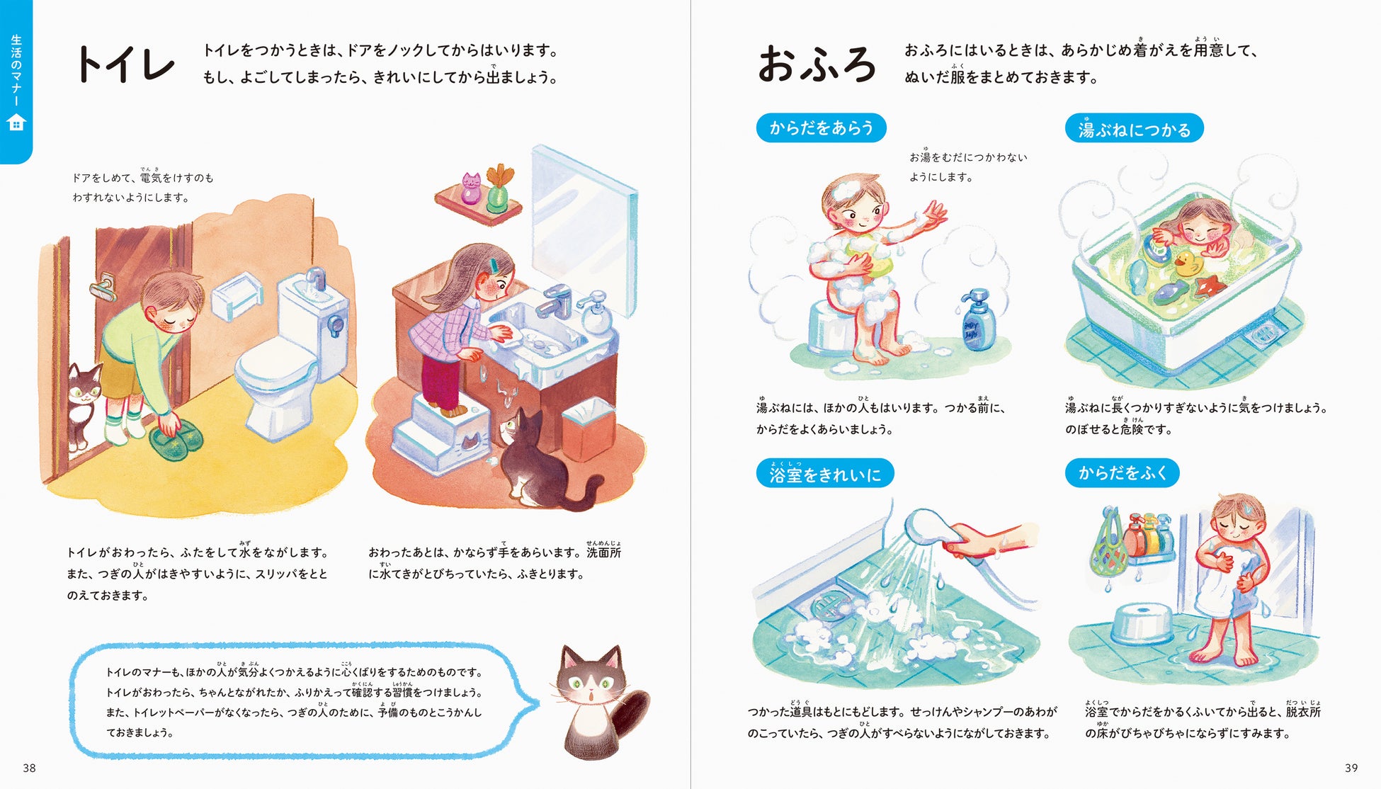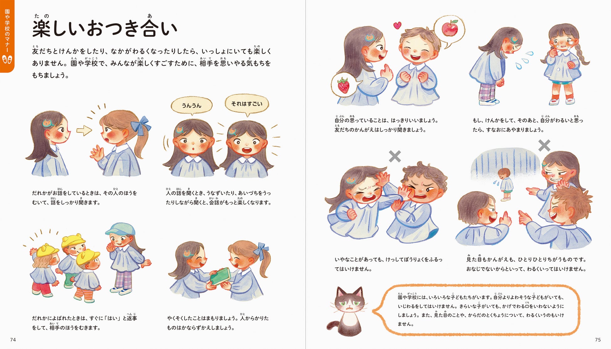 マナーの基本的な考え方や、その場ですべき行動は、子どものうちにこそ学ぶべきものです。なぜなら、友だちや周りの人を思いやる気持ちが育まれ、周りのみんなが心地よく過ごせることを考えられる子になると、友だちとの関係が良好に保てます。また、ご近所の方や先生など誰からも愛され、お子さん自身も心地よく楽しい日々が送れるからです。(中略)幼い頃から正しいお行儀を身につけられると、お子さんが成長してからも迷いがなく、今後の人生に於いて大いに役立つことでしょう。「こんなときどうする?」と、ぜひ親子で考え意見を交わされながら、繰り返しご覧になってください。