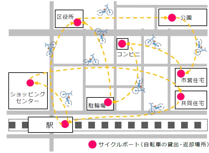 ・シェアサイクルは、地域内に設置された複数のサイクルポートを相互に利用でき、借りた場所でなくても自転車が返却できる利便性の高い交通システムです。