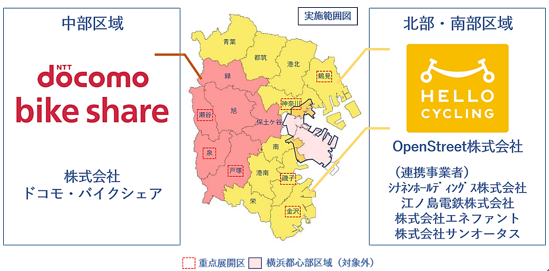 横浜都心部区域(ベイバイク実施エリア)を除く市内を3つの区域(うち7区は重点展開区として先行的に事業展開)に分け、下図の体制で事業を実施します。