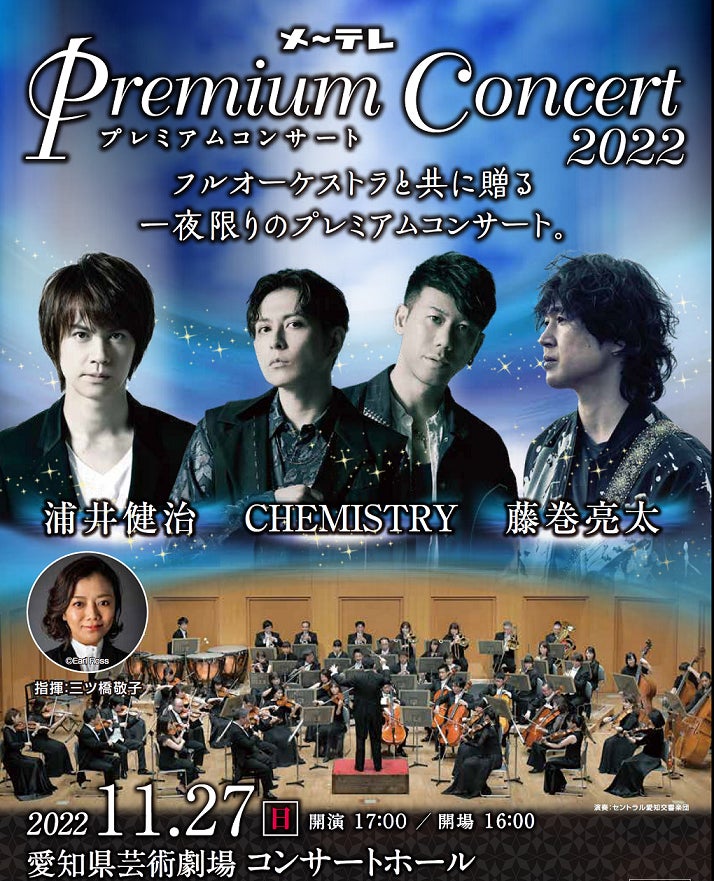 メ~テレ(名古屋テレビ放送)では、浦井健治、CHEMISTRY、藤巻亮太が、フルオーケストラと共に贈る一夜限りのコンサートを2022年11月27日(日)、愛知県芸術劇場 コンサートホールで開催します。