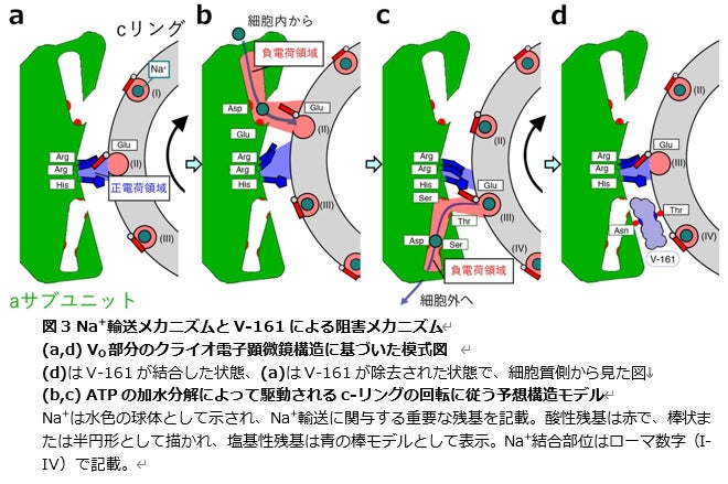 Na+輸送経路は、これまで詳細な構造が不明でした。しかし、本研究でNa+がいかにcリング内で結合(図3 b)・解離し(図3 c)、aサブユニットを介して細胞外に輸送(図3 a-c)されるのか、その具体的なメカニズムが明らかとなりました。