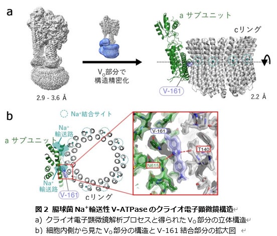 研究チームは、VREのアルカリ環境での生育に必須となるナトリウムポンプ(Na+輸送性VoV1-ATPase)(注2)の阻害剤「V-161」を同定しました。そして、V-161の投与によりマウス小腸でのVREの定着が抑制されることを発見しました。さらに、ナトリウムポンプとV-161の結合部位の詳細な立体構造を解明し、ナトリウム輸送の仕組みとV-161による阻害の仕組みを明らかにしました。