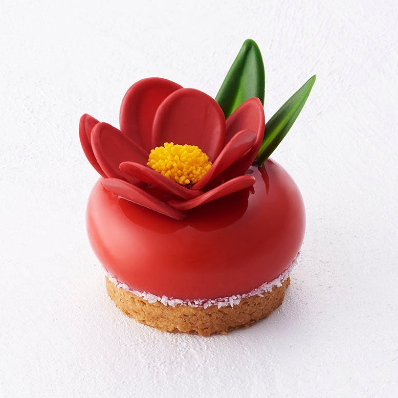 冬の間真っ赤な花を咲かせる寒椿をモチーフに。ホワイトチョコレートムースで甘酸っぱいフランボワーズムース、フランボワーズをとじ込めて。