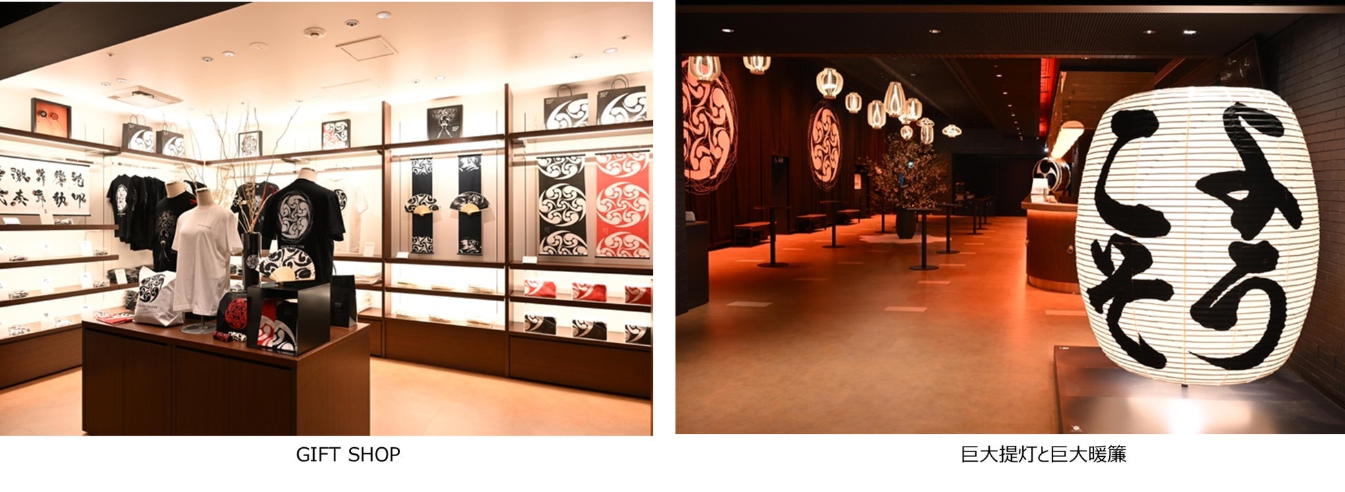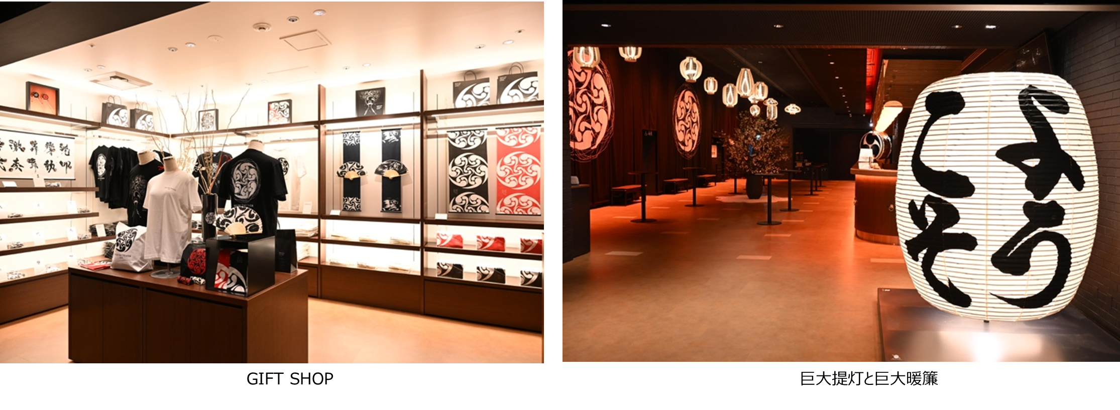加えて、空間演出においても、日本らしさとDRUM TAO の世界観を体感いただけるよう、随所に工夫を施しています。入口には、劇場の象徴となる巨大提灯と巨大暖簾を設置。提灯は江戸時代より続く「小嶋商店」と、世界最大級の大きさを誇る暖簾は大正創業の老舗「のれん中むら」と共同制作いたしました。そこに描かれる紋は、伝統技法と現代技術を融合した「京源」紋章上繪師である波戸場承龍氏、波戸場耀鳳氏によるオリジナル作品です。来場者が足を踏み入れた瞬間から、日本の伝統文化と非日常を体感できる空間を創出しています。これにより、本劇場はDRUM TAO の公演を単に「鑑賞する」場にとどまらず、京都の夜を過ごす一つの文化体験として楽しめる点も大きな価値となっています。