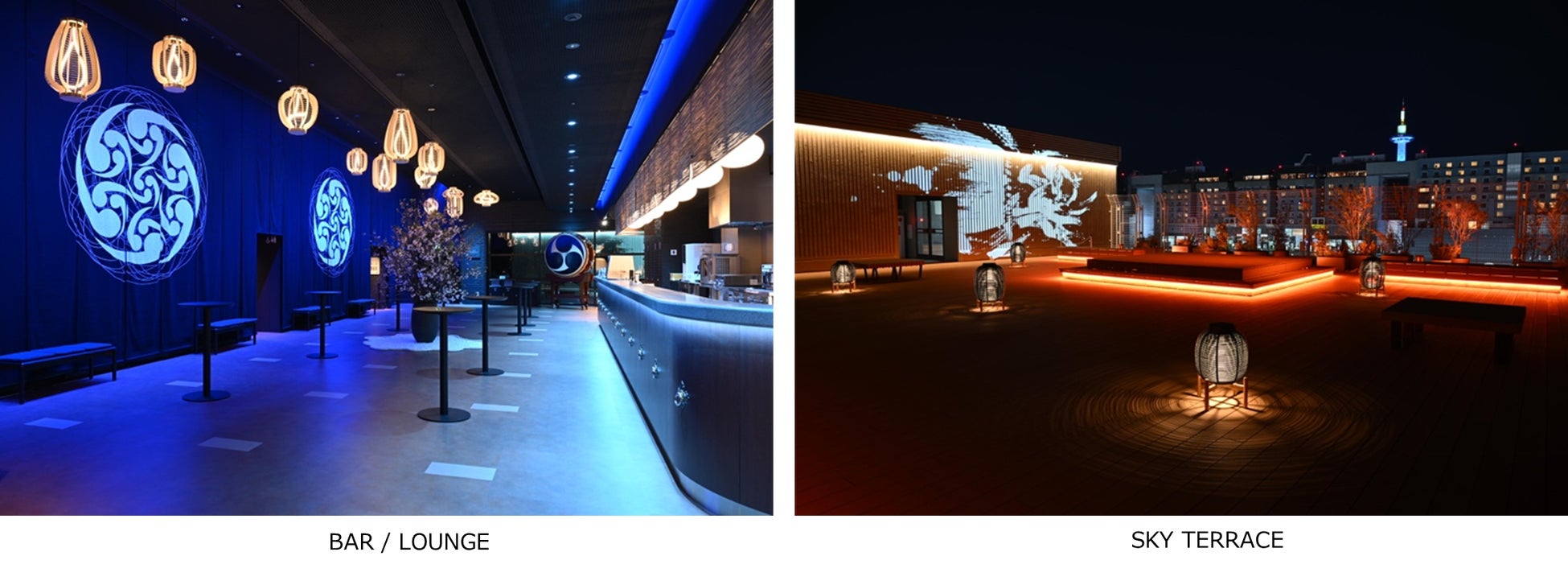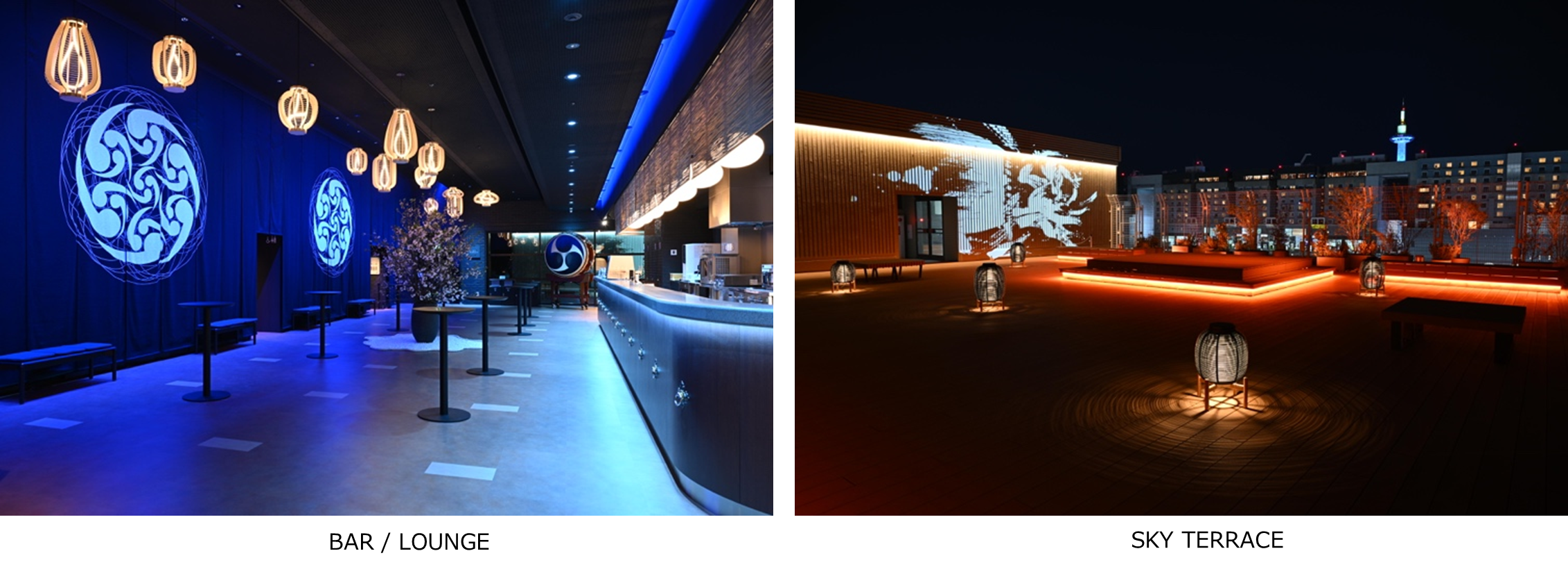 さらに、本劇場には、バーカウンターを設け、厳選されたドリンクやフードを楽しめる「LOUNGE」や、自然を感じながら京都の街並みを一望することもできる開放感あふれる「SKY TERRACE」、本劇場オリジナルグッズが購入できる「GIFT SHOP」を併設し、劇場体験を通して、京都の夜を最大限楽しめる場を用意しています。