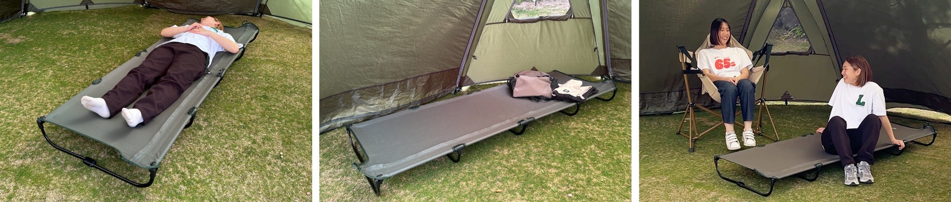 ゴツゴツした地面でのキャンプや、地面からの熱気や冷気が気になる季節のキャンプでも、快適な睡眠スペースを確保できる。シートの張りが身体をしっかり支え、耐荷重も約120kgまでと大柄な方でも使用可能。地面に直接置きたくない荷物などを一時的に置く場所や、リラックスタイムのベンチとしても活躍。