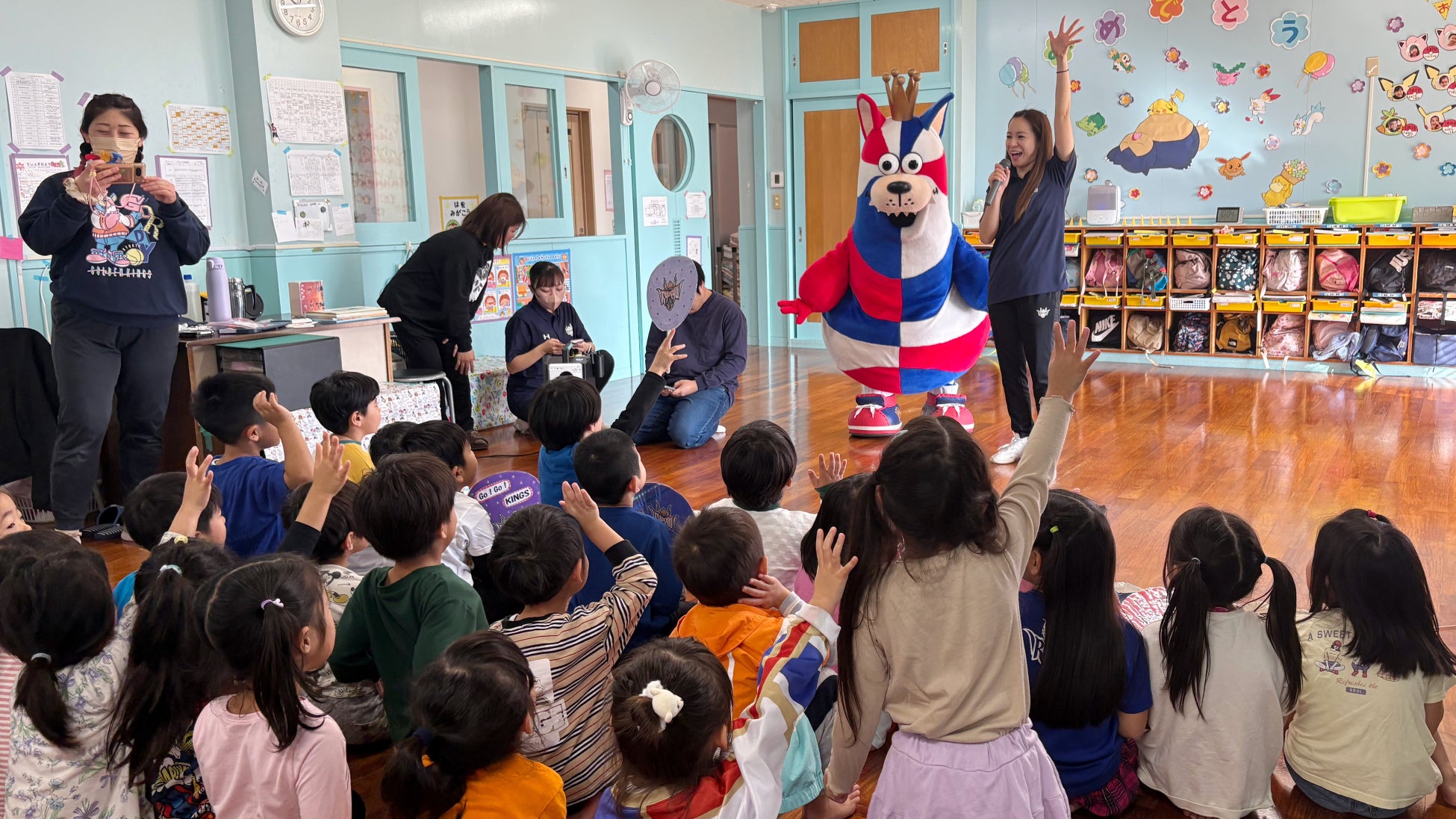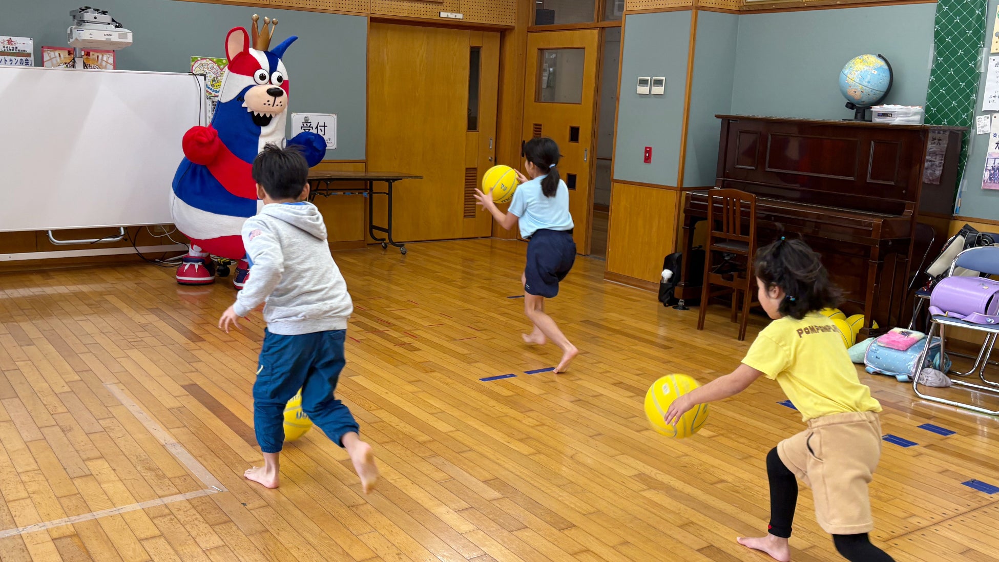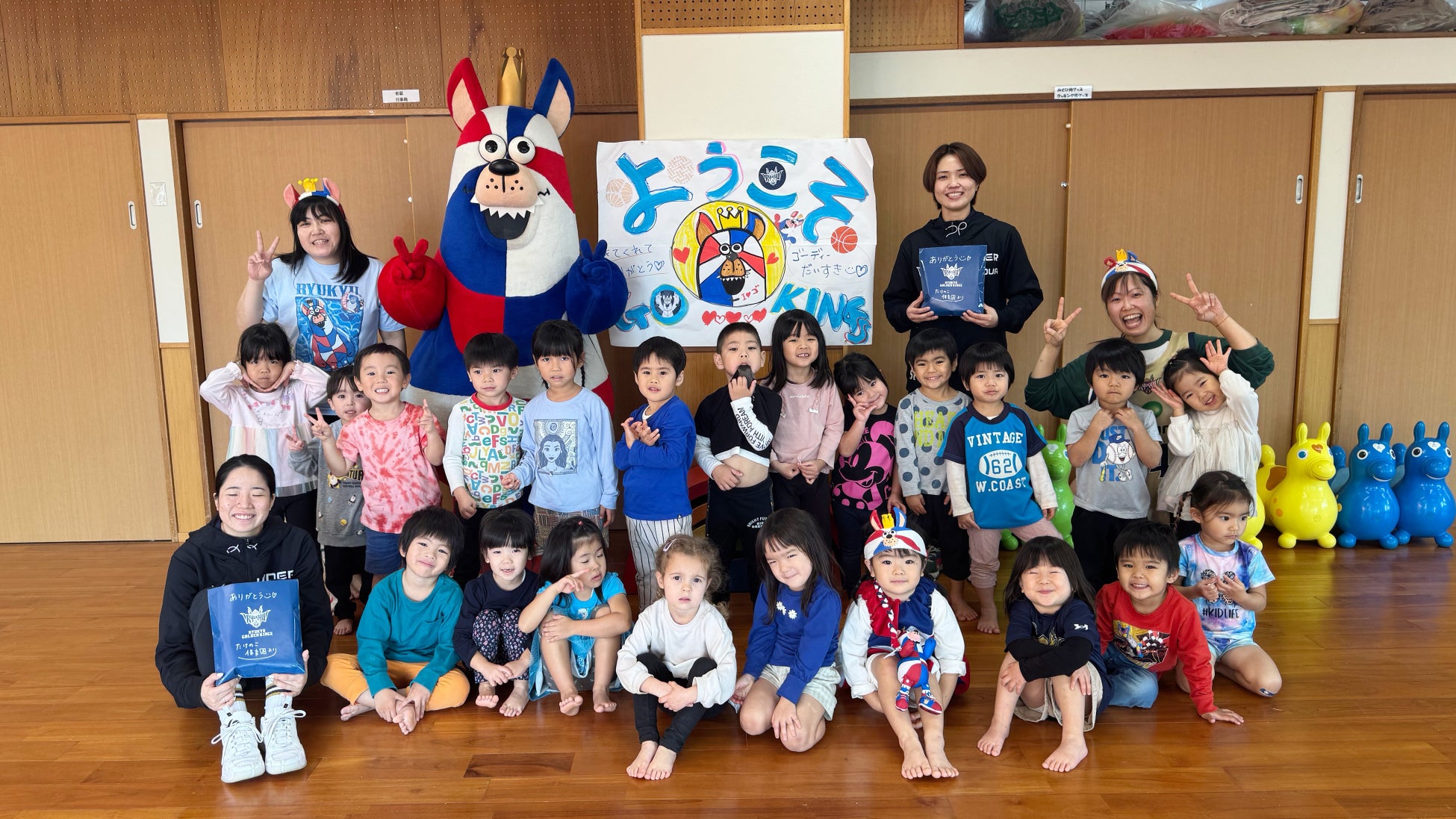 ボール遊びでは、手作りのゴーディー衣装を着て参加してくれた子どもたちや、キングスグッズを身につけ温かく迎えてくださった園もありました。子どもたちとはゲームやパスリレーを楽しみ、見学していた子どもたちからも「ゴーディー!」と大きな声援をいただきました。じゃんけん大会や写真撮影も行い、笑顔あふれる交流のひとときとなりました。