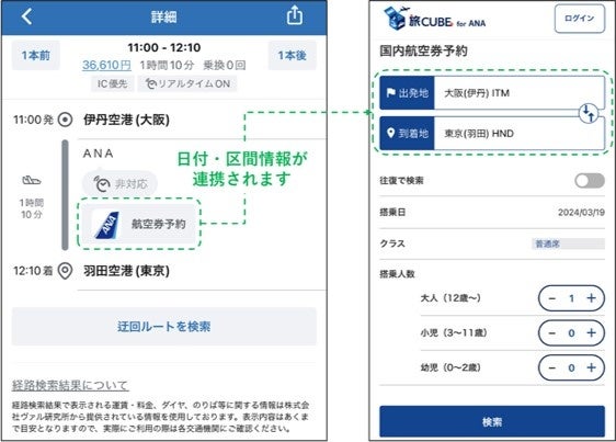 「WESTER」からANAの航空便の利用を含むルートを検索した際、「ANA航空券予約」ボタンが表示されます。検索した航空便の区間を保持したまま「旅CUBE」に遷移し、再度日付、区間情報を入力せずにANA航空券の予約・決済ができます。