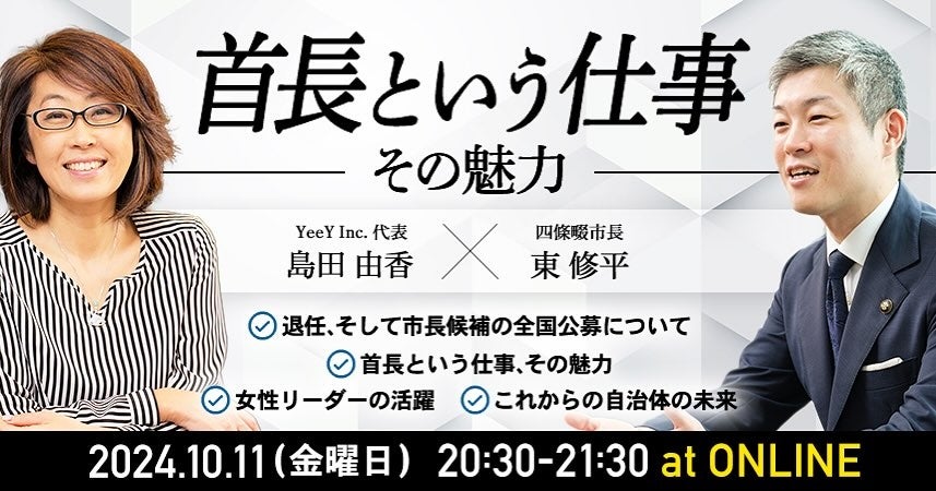 「首長という仕事のやりがいや魅力」を軸に、東修平氏が特別ゲストと対談するイベントがオンラインで開催されます。10月11日(金)20:30~は、元ユニリーバ・ジャパン取締役・YeeY Inc.代表の島田由香氏と「首長という仕事 ーその魅力ー」をテーマに開催。ユニリーバ・ジャパンにおいて、働き方改革を軸とした組織の改革を多く実施され、地域活性の観点でも幅広く活躍した島田氏と対談を通し、首長の魅力、女性リーダーの活躍、これからの自治体の未来を語ります。ぜひご参加ください。