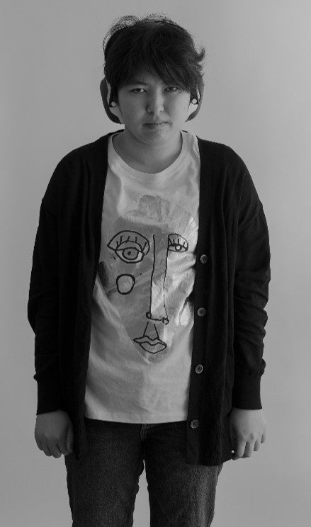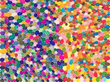 学校に行けず暇を持て余していた時期に、作家の母が「マルを描いて」と紙とペンを渡したのが創作のはじまり。マルというモチーフが彼女のなかでピタリとはまり熱中するようになる。マルを描き始めて5年になるが、近年はマル以外のモチーフも描くようになり、マル、サンカク、シカクのモチーフを大きなカンバスに日々飽きることなく描き続ける。コミュニケーションとして発する言葉はわずかだが、頭に浮かんだであろう言葉を繰り返し呟き、言葉と一緒に作品が生まれることもある。