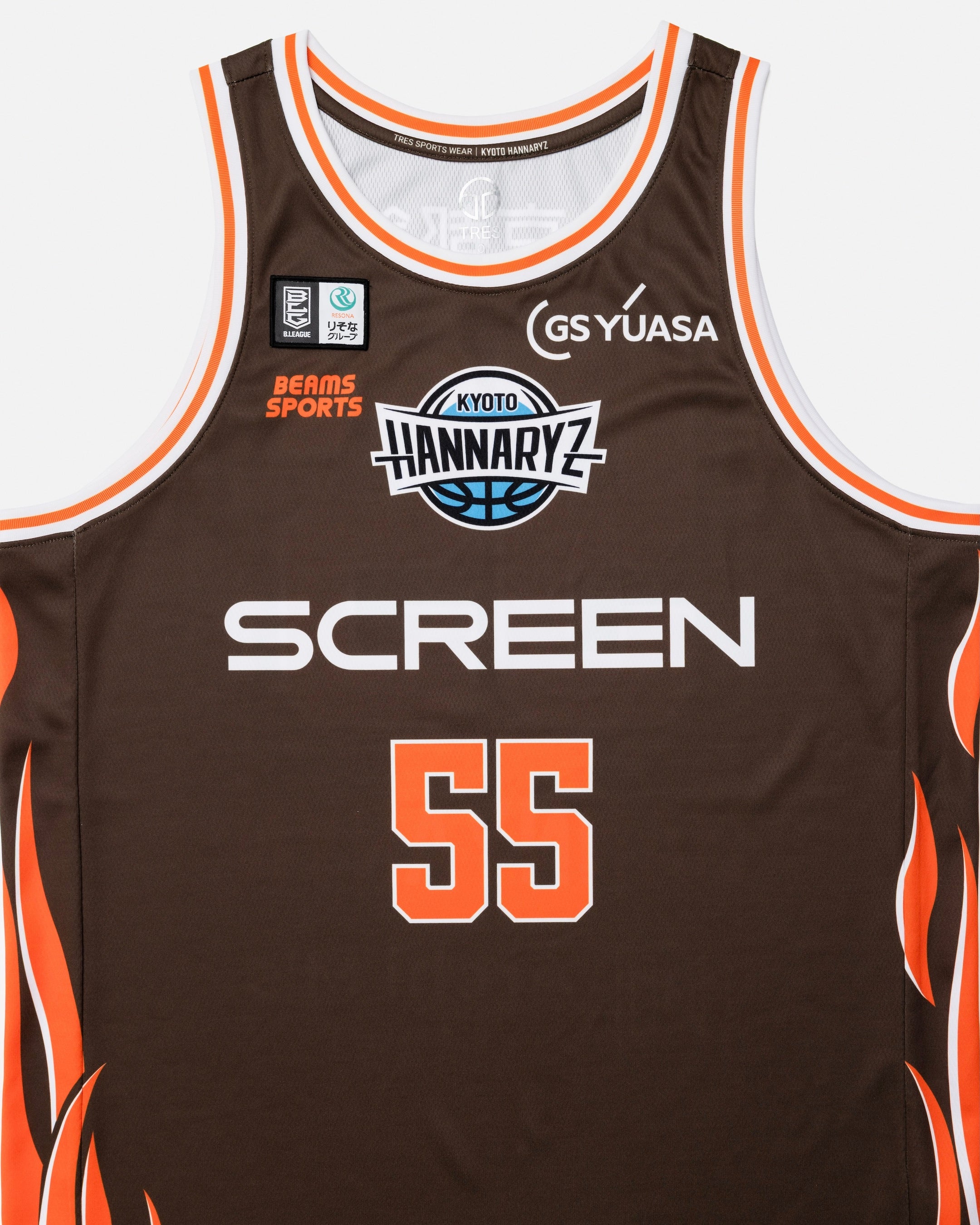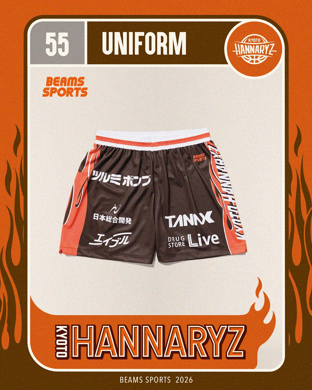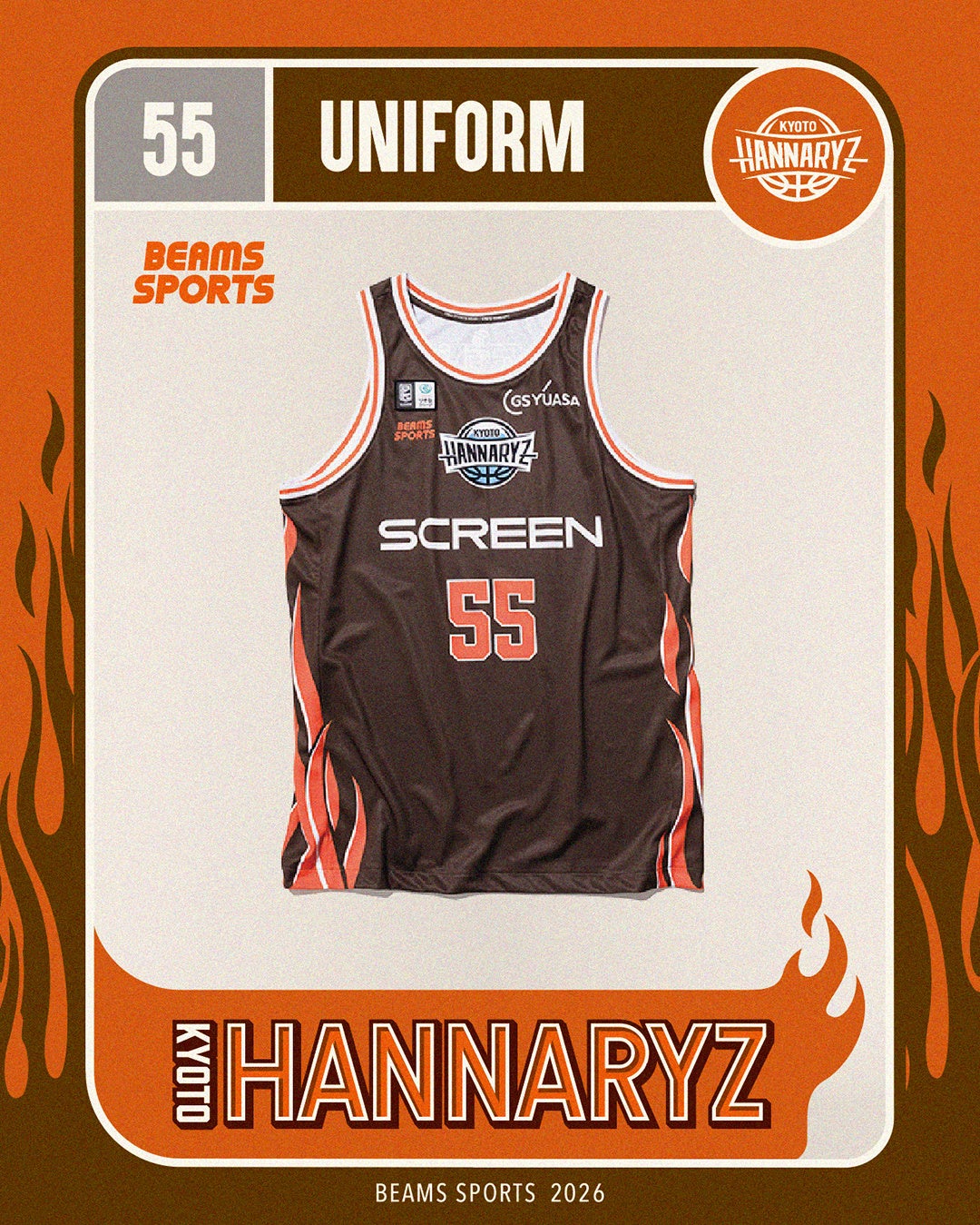 京都ハンナリーズ史上初となる〈BEAMS SPORTS〉によるコラボレーションユニフォームは、京都ハンナリーズの佇まいからインスパイアされた「静かに燃える闘志」を、〈BEAMS SPORTS〉を象徴するオレンジのファイヤーパターンへと昇華させました。