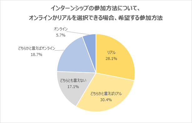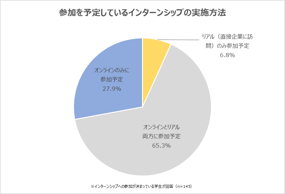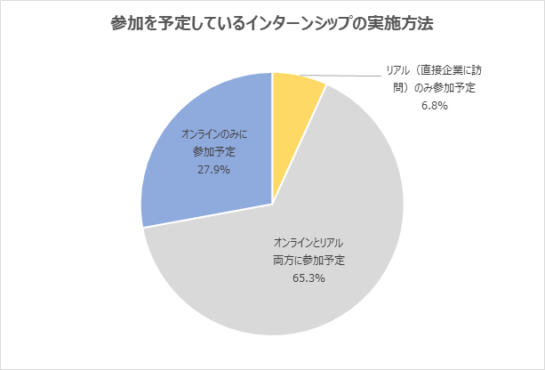 参加を予定しているインターンシップの実施方法は、「オンラインとリアル両方に参加予定」が65.3%で最多。次いで、「オンラインのみに参加予定」27.9%が続きました。「リアル(直接企業に訪問)のみに参加予定」の回答は6.8%に留まっています。