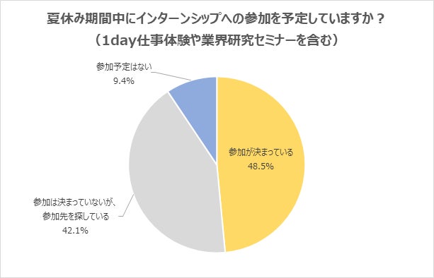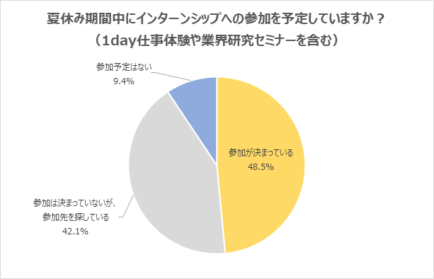 (1) 約半数が「夏休み期間中にインターンシップに参加予定」と回答。「参加先を探している」の回答も4割を超える