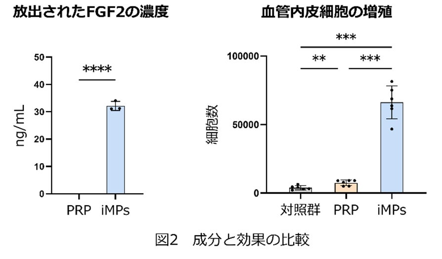 研究グループはまず、iMPsから放出される成長因子の濃度を測定し、従来のPRPと比較しました。複数の創傷治癒を促進する代表的な成長因子が、iMPsとPRPの両方から高濃度で検出されました。しかし、有効な成長因子のひとつであるFGF2(注5)は、PRPからは検出されず、iMPsのみで検出されました(図2左)。同じヒト血小板を含むiMPsとPRPですが、放出される成長因子は部分的に異なっていることが分かりました。