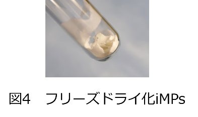 最後に、将来的な臨床応用を見据えて、研究グループはiMPsを凍結乾燥することで長期保存や輸送への適応を試みました。粉末状に加工したフリーズドライ化iMPs(図4)を3か月間4℃で保管し、蒸留水に溶かして成長因子の濃度を測定しました。その結果、加工していない通常のiMPsよりもさらに高い濃度の成長因子がフリーズドライ化iMPsから検出されました。またそれらを糖尿病マウスの皮膚潰瘍に投与したところ、通常のiMPsと同等の創傷治癒促進効果が確認されました。この結果により、凍結乾燥はiMPsの長期保存や輸送を可能にし、製剤化に向けての有効な手法であることが示されました。