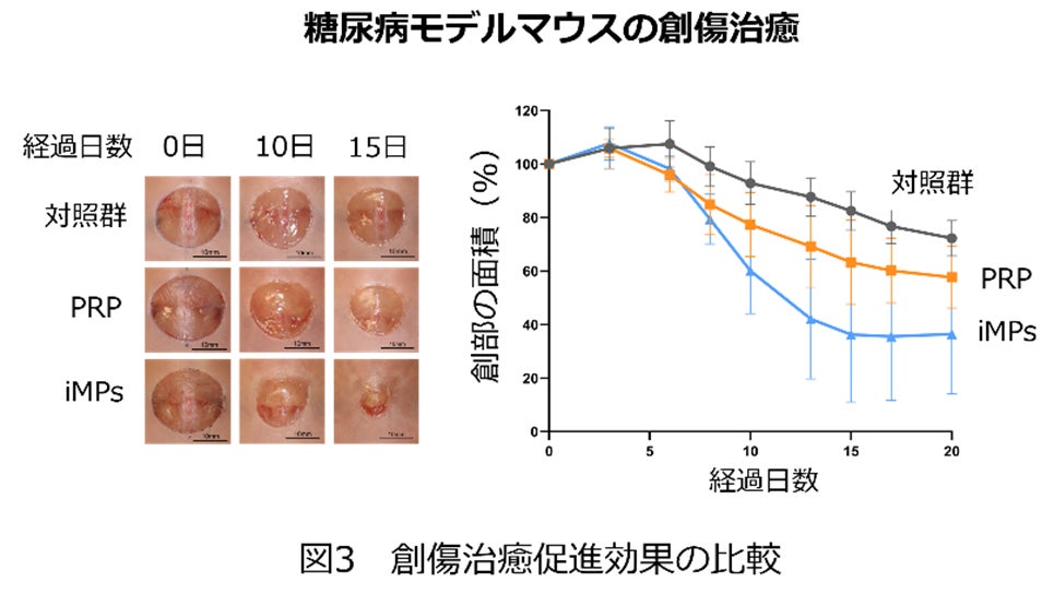糖尿病は、難治性潰瘍の原因として頻度の高い疾患の一つです。研究グループは、糖尿病マウスの背部に皮膚潰瘍を作成し、iMPsもしくはPRPを創面に投与して経過を観察しました。その結果、投与の10日後にはどちらも対照群と比べて創部の面積が縮小していました。また13日目以降では、iMPsを投与した群はPRPを投与した群よりも創部が縮小しており、iMPsがPRPを上回る効果を示しました(図3)。皮膚組織を採取して染色標本を観察すると、創部におけるコラーゲンの合成や血管の形成がiMPsによって促進されていることが分かりました。iMPsはPRPよりも多くの血管形成を誘導していましたが、この結果は血管内皮細胞の増殖促進効果の違いを反映していました。