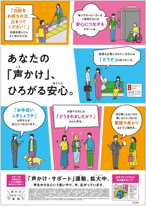 「声かけ・サポート」運動は、お客さまに鉄道などの施設を安全に安心してご利用いただけるよう、お困りのお客さまに対して社員等から積極的に声をおかけするとともに周囲のお客さまからもお声かけにご協力いただく取り組みです。