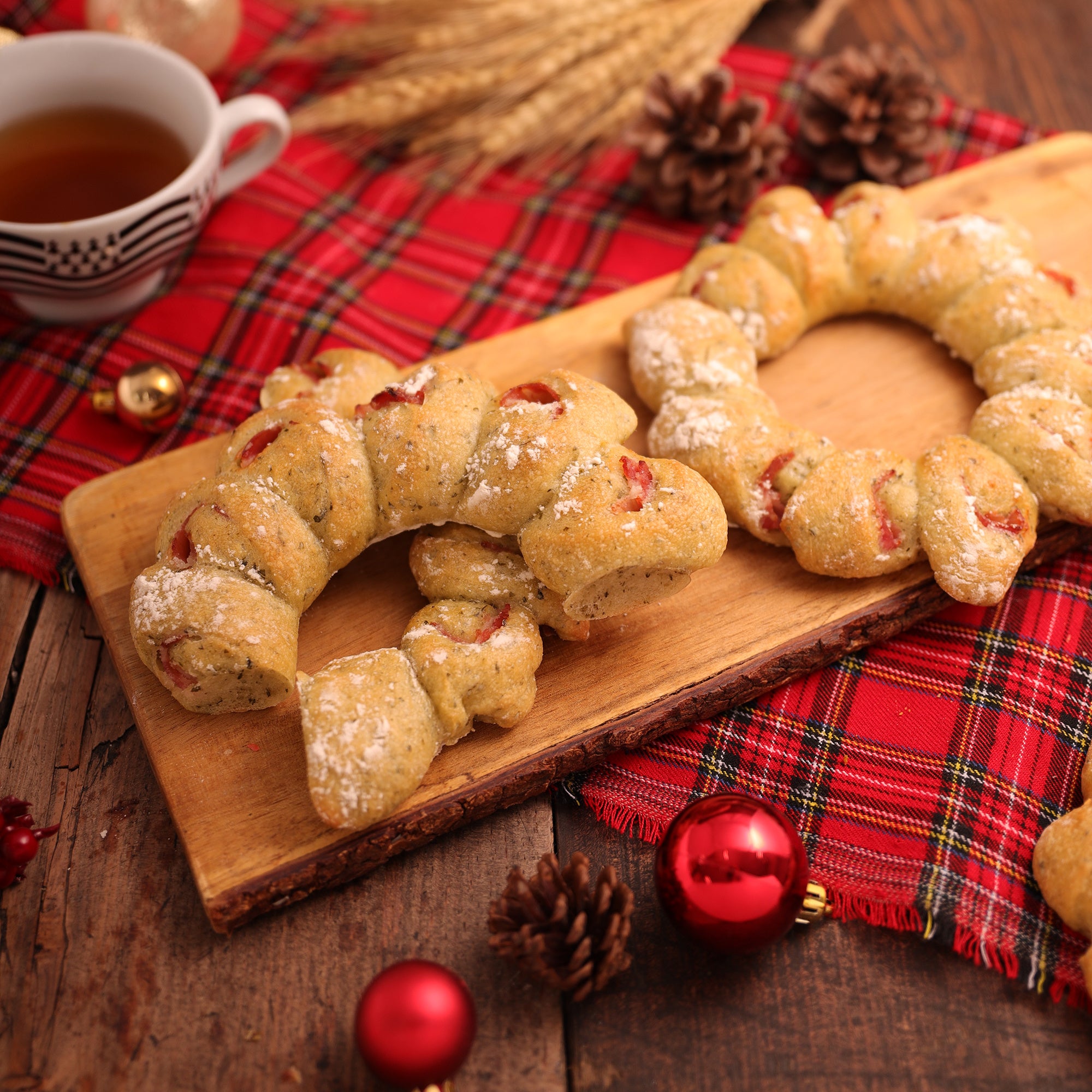 バジル・オリーブオイル・チーズを使ったジェノベーゼソースを練り込んだフランスパンをリースの形にしてベーコンを包みました。