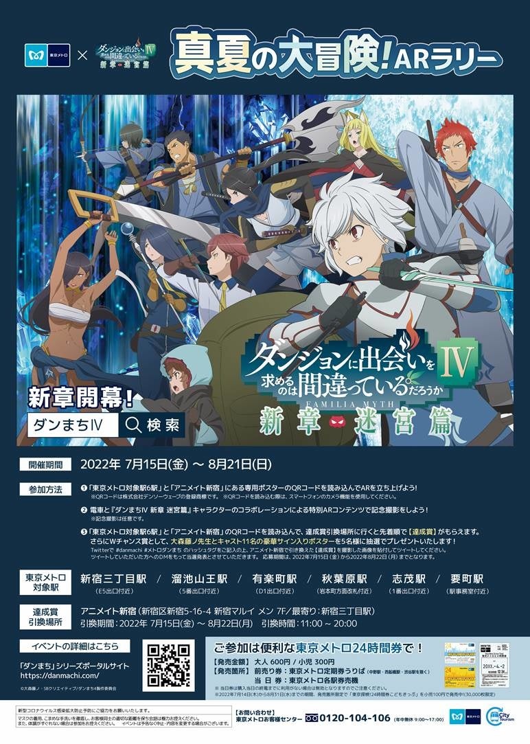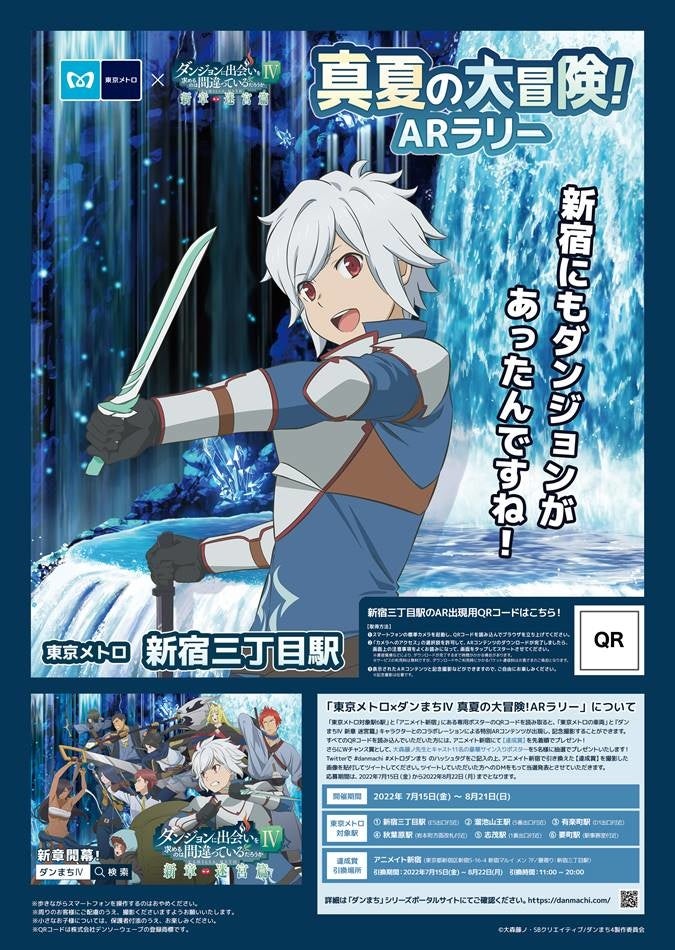 東京地下鉄株式会社(本社:東京都台東区、代表取締役社長:山村 明義、以下「東京メトロ」)では、「東京メトロ×ダンまちⅣ 新章 迷宮篇」真夏の大冒険!AR※ラリーを2022年7月15日(金)から8月21日(日)まで開催します。