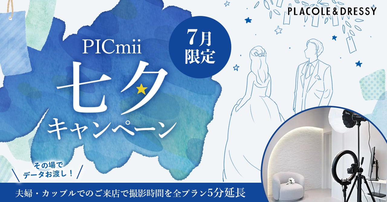 セルフ写真館 PICmiiは、カメラ専門店「カメラのキタムラ」のグループ会社として、撮影画質の仕上がりにこだわったセルフ写真館で、個室での自由な撮影をお楽しみいただけます。DRESSY ROOM YOKOHAMA/NAGOYAスタジオでは、7月限定で『七夕キャンペーン』を実施。七夕にちなみ、7月中に夫婦・カップルでご来店いただいたお客様を対象に、撮影時間を通常プランより5分間延長してご案内いたします。(ご予約時に「七夕割を見た」とお伝えください) この季節ならではの特別なキャンペーンとして、記念日やお出かけの思い出づくりにご活用いただければ幸いです。※ご予約時またはご来店時に「キャンペーンの記事を見た」とお伝えください。
