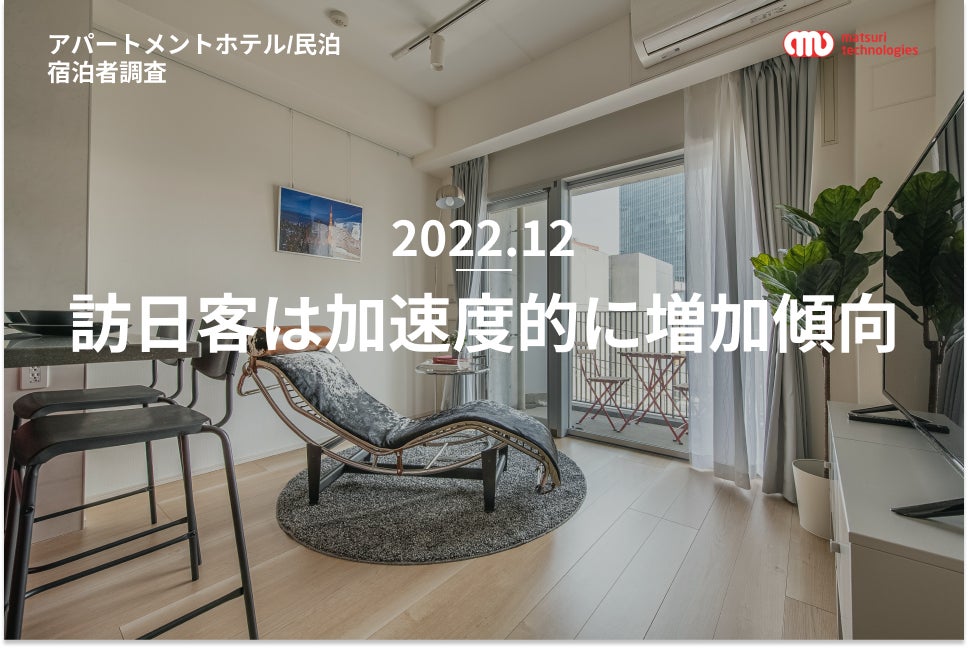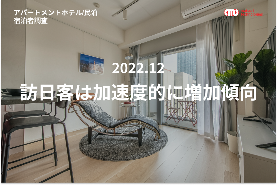 日本全国でアパートメントホテルや住宅宿泊事業法のインバウンド向け宿泊施設を提供するmatsuri technologiesは、2022年12月の宿泊の予約データを分析し、結果を公開します。