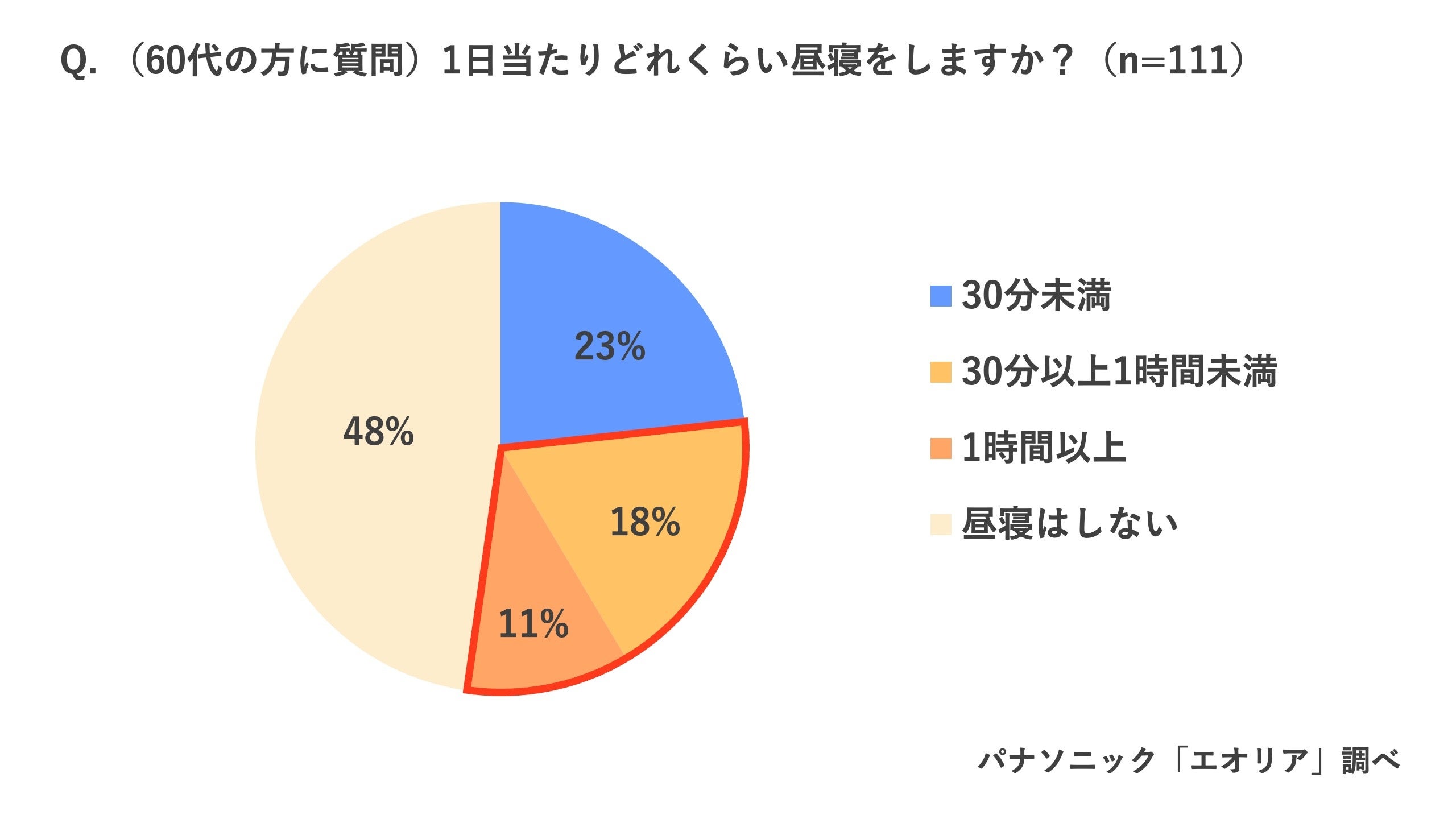 今回、60代の昼寝について調査したところ、約3割が昼寝を30分以上することがわかりました。昼寝の際には15時よりも前に30分以内の仮眠で済ませましょう。(個人差はありますが、一般的に年齢によって昼寝の時間にも差があり、若年成人では20分程度、高齢者は30分程度を目安にしましょう。)また、朝起きた時にしっかり光を浴びる、規則正しい食事、眠くないのに早くに布団に入らないようにするなどして、睡眠の質を高めましょう。