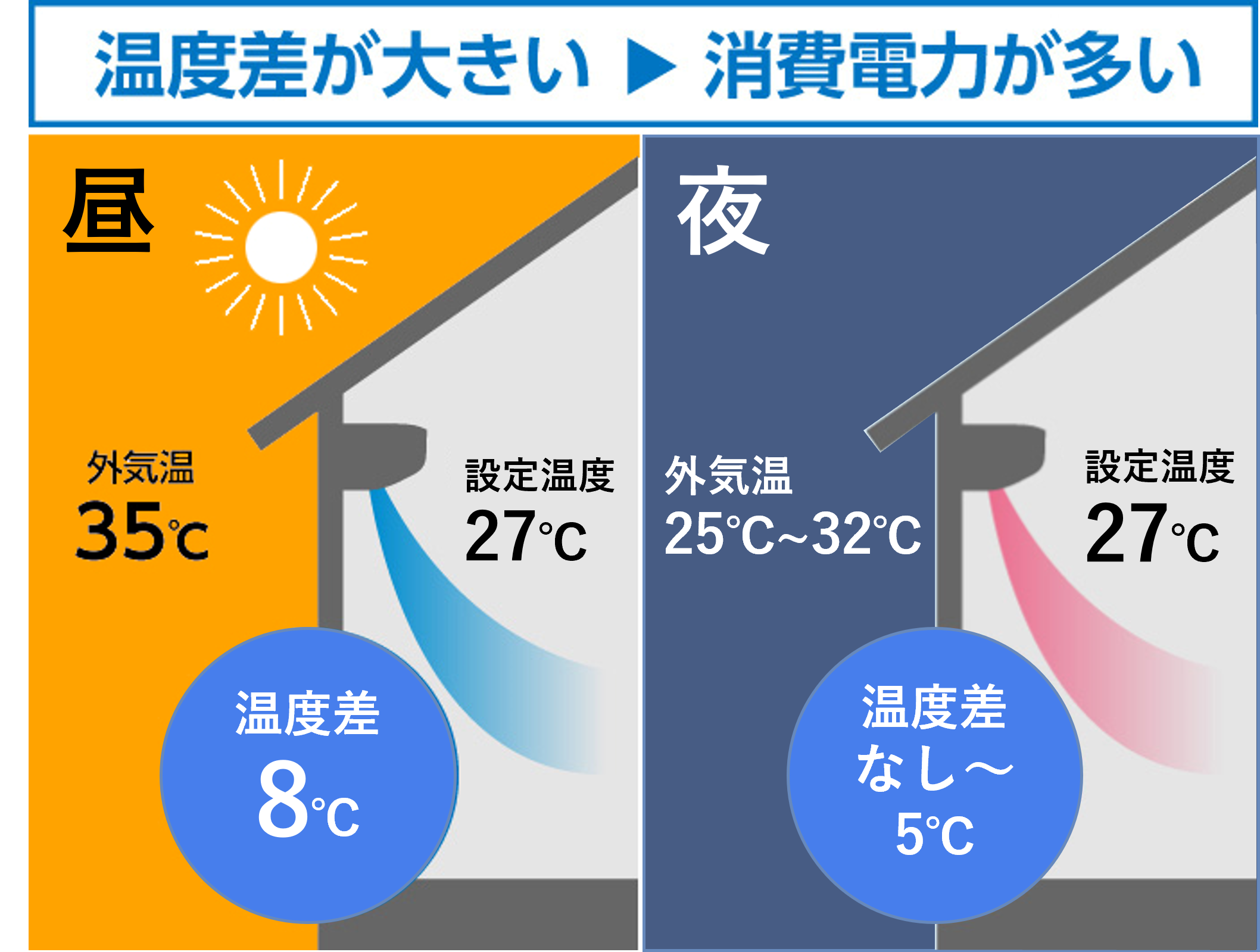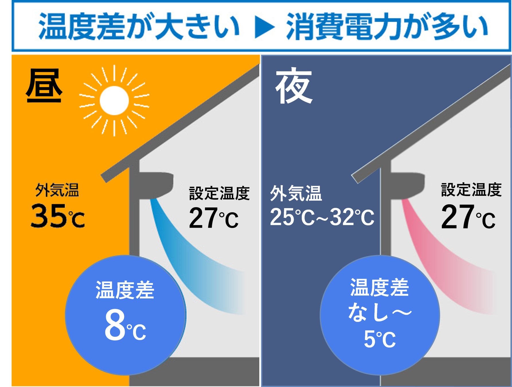 夏の夜間のエアコン使用における消費電力量は日中よりも少ない!?