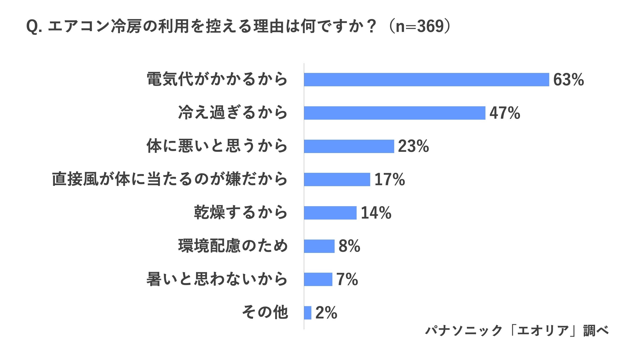 エアコンをつけっぱなしで利用しない理由については、「電気代がかかるから」(63%)、「冷えすぎるから」(47%)、「体に悪いと思うから」(23%)が上位の結果となりました。