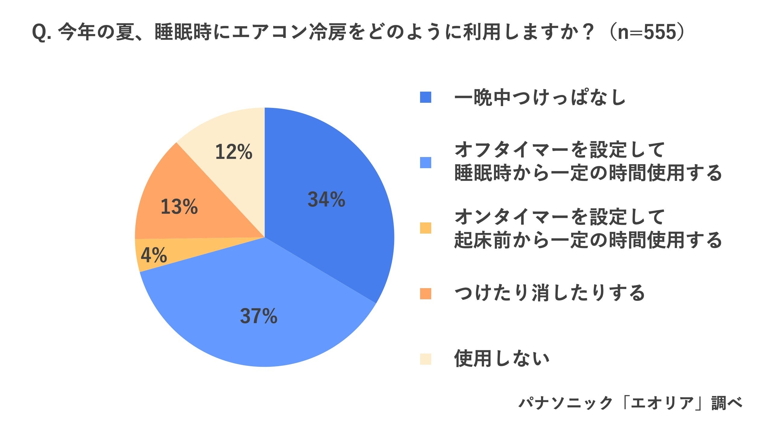 「今年の夏、暑さで寝苦しいことはありますか?」という質問では、「頻繁にある」(21%)、「時々ある」(56%)と77%が「ある」と回答しています。暑さによる寝苦しさを反映してか、睡眠時のエアコンの利用状況については、「オフタイマーを設定して睡眠時から一定の時間使用する」が最多の37 %、つづいて「一晩中つけっぱなし」が34%と、多くの方が積極的に使用していることがわかりました。一方で、「つけたり消したりする」(13%)、「使用しない」(12%)と、一定数の方はエアコンの使用に消極的なようです。