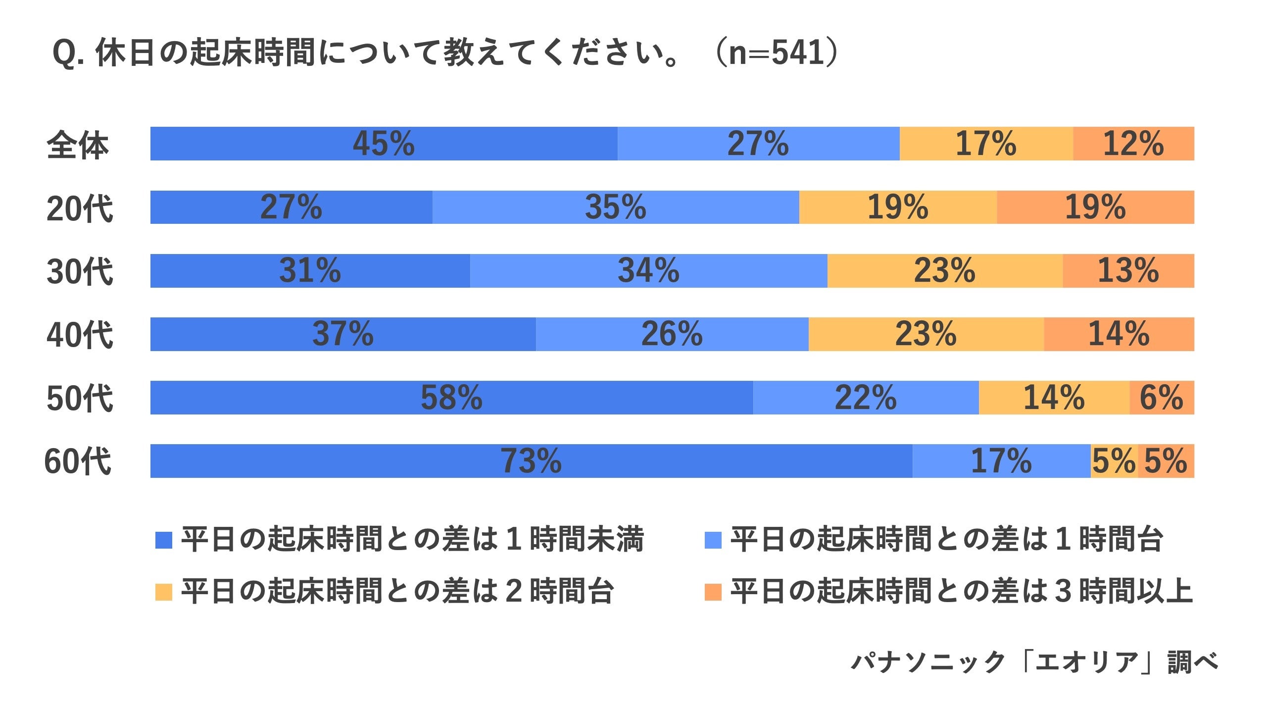 今回この「寝だめ」について世代別に調査したところ、働きざかりの20代〜40代において顕著に「寝だめ」の傾向が見られ、約4割の方が平日の起床時間との差が2時間以上あることがわかりました。20代では、約2割が平日の起床時間との差が3時間以上と回答しており、特に「寝だめ」傾向が高いことがわかります。