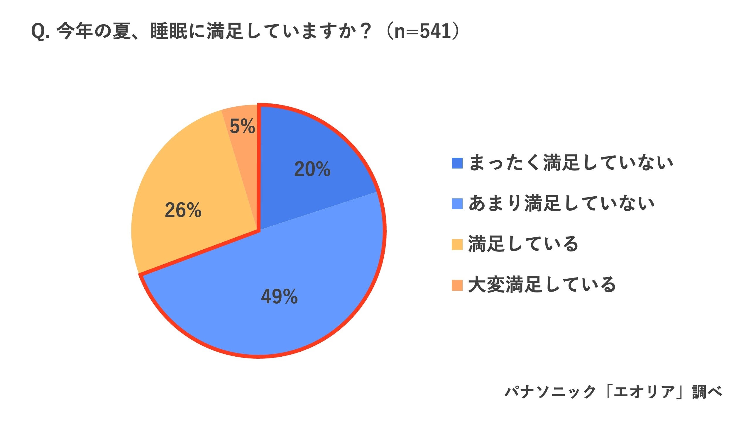 はじめに、今年の夏の睡眠の満足度についてたずねたところ、「まったく満足していない」(20%)、「あまり満足していない」(49%)と、69%が満足していないことがわかりました。