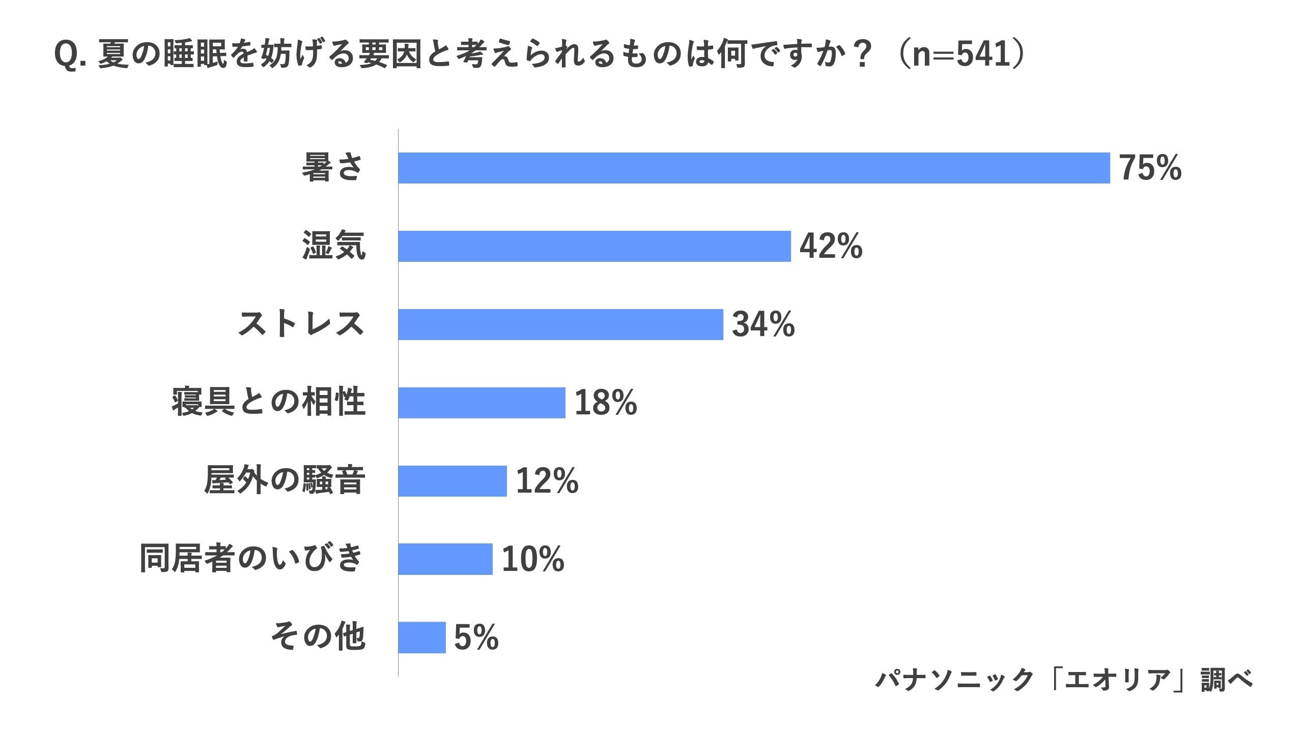 睡眠を妨げる要因については、「暑さ」が圧倒的に多く75%、つづいて「湿気」(42%)、「ストレス」(34%)という結果になりました。