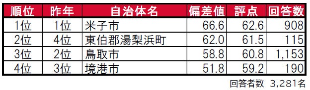 住みここち1位は3年連続で米子市。2位は東伯郡湯梨浜町、3位は鳥取市。