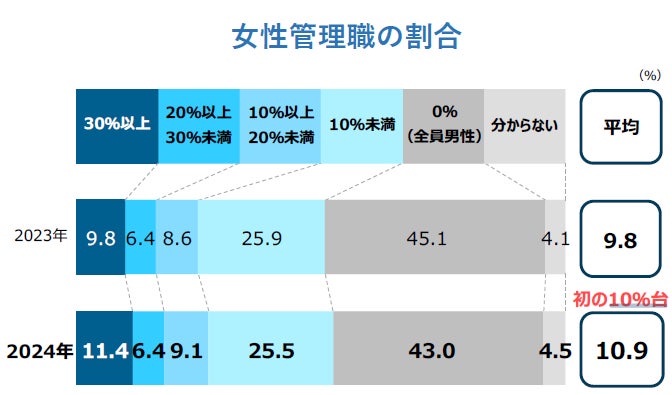 管理職に占める女性の割合の平均は10.9%と調査開始後初めて10%台に乗った[1]。前年からの上昇幅は1.1ポイントと2021年と並び過去最大の伸びとなった。