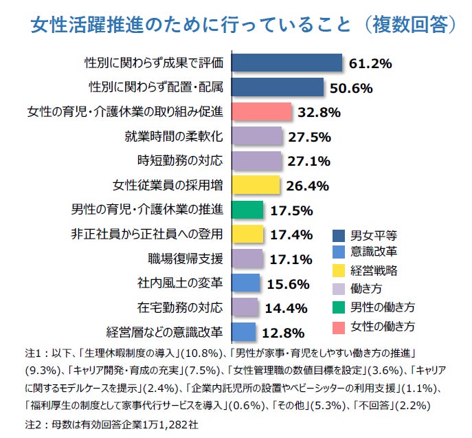 女性の活躍推進のために自社で行っていることについて尋ねたところ、「性別に関わらず成果で評価」が61.2%でトップとなった(複数回答、以下同)。「性別に関わらず配置・配属」(50.6%)が続き、男女平等に関わる項目が上位に並んだ。以下、「女性の育児・介護休業の取り組み促進」(32.8%)といった、女性が働きやすい環境づくりに関する対応策が続いた。