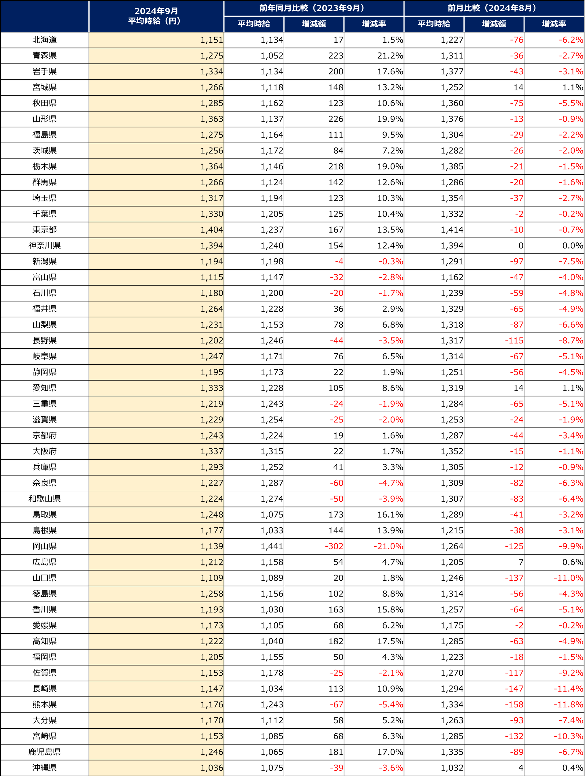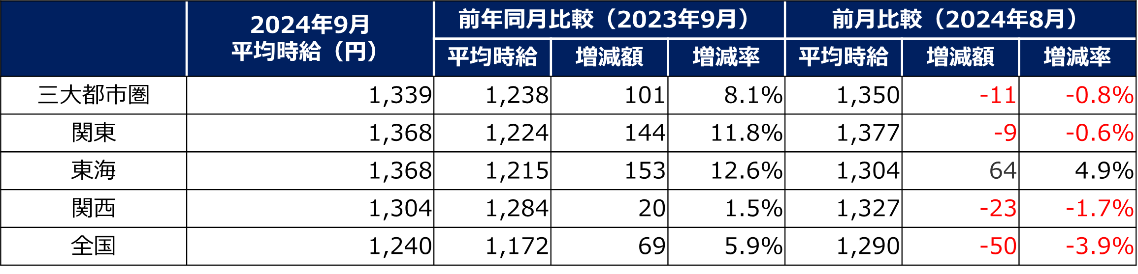 9月度平均時給、三大都市圏は1,339円。全国は1,240円。
