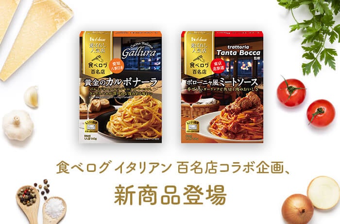 2018年8月よりレトルトカレーで展開している「食べログ 百名店」とハウス食品のコラボ商品「選ばれし人気店」シリーズに、新たにパスタソースが登場します。今回は、2021年・2023年に「イタリアン 百名店」に選出されている「trattoria Tanta Bocca」(東京都渋谷区)と「Cucina Italiana Gallura」(愛知県名古屋市)の監修による2商品が同時発売されます。全国の食べログユーザーから高い評価を得ている名店のパスタを、ご自宅で手軽にお楽しみください。