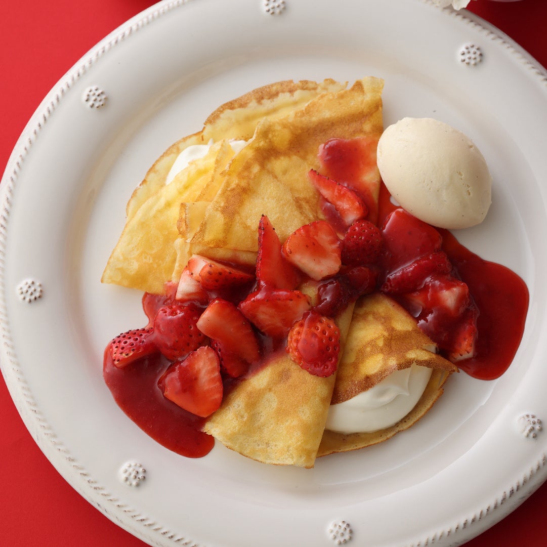 焦がしバターを加えてこんがりと焼いた自家製クレープに、程よい甘さのクレーム・シャンティを包みました。たっぷりの苺とバニラアイスを添えて。