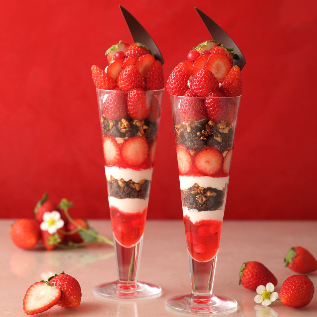 苺アイス、フランボワーズ香るマスカルポーネクリームと白ワインジュレ、ザクザク食感のカカオクランブルなど、主役のフレッシュ苺を引き立てる食材を何層にも重ねました。