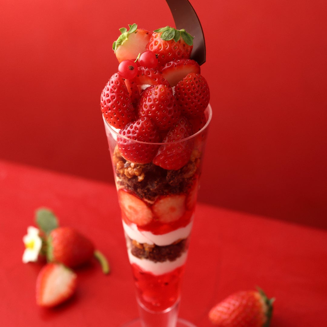 フェアの中心は、食べ進めるごとに様々な味わいを楽しめる「苺のパフェ」。