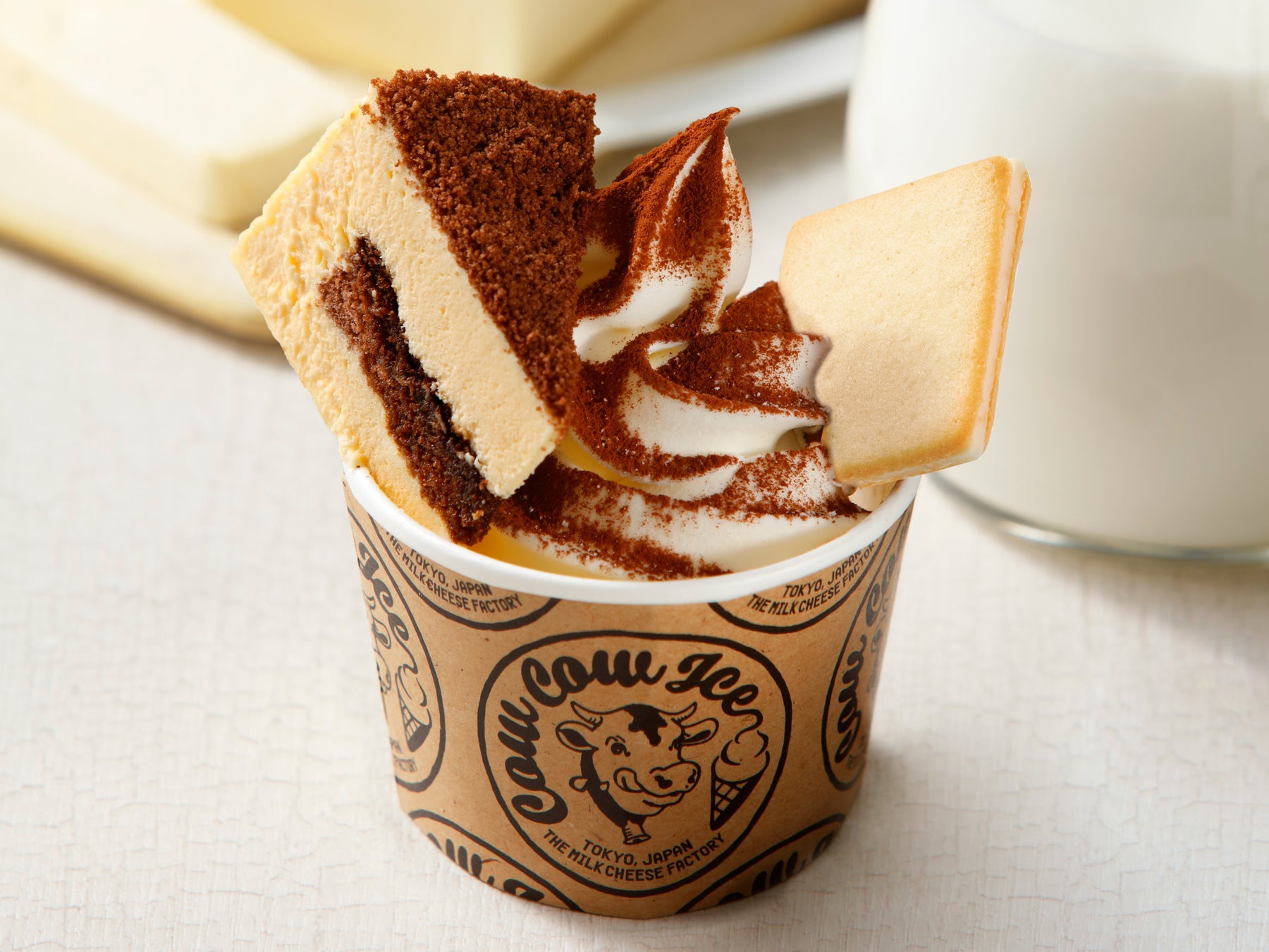 北海道産ジャージーミルクを使用したクリーミ―な”ミルク”と2種類のクリームチーズと北海道産ゴーダチーズを使った濃厚な”チーズ”の両方の美味しさを味わえる贅沢な「アイスクリーム」の上に、「ミルクチーズケーキティラミス」と定番人気の「ソルト&カマンベールクッキー」をトッピングしたスペシャルなサンデーです。