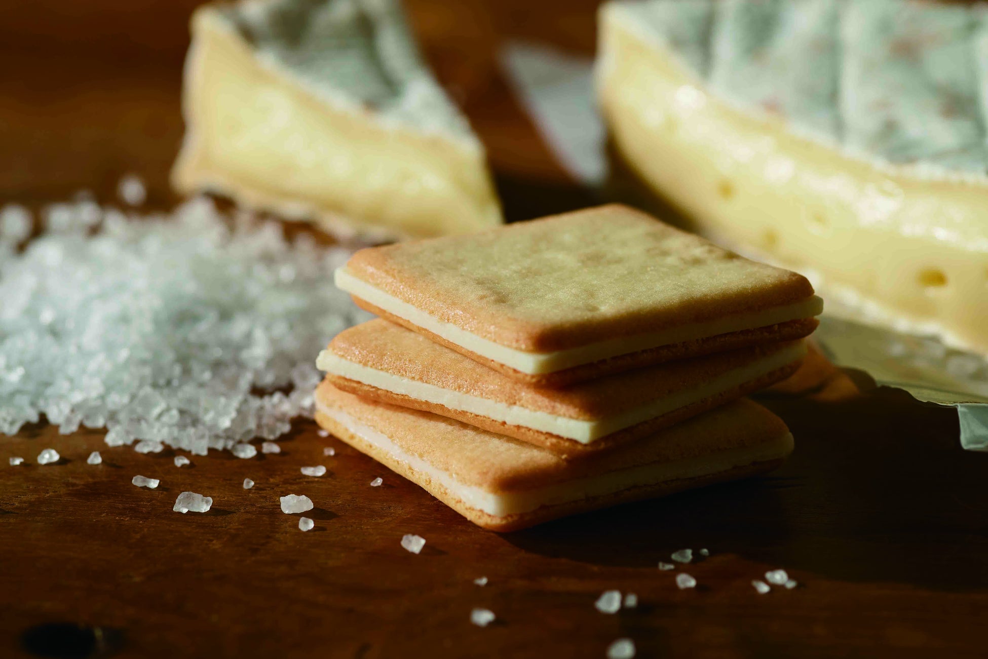 北海道牛乳とフランス産ゲランドの塩を使った生地に、カマンベールチーズのチョコプレートをサンドしたクッキーです。