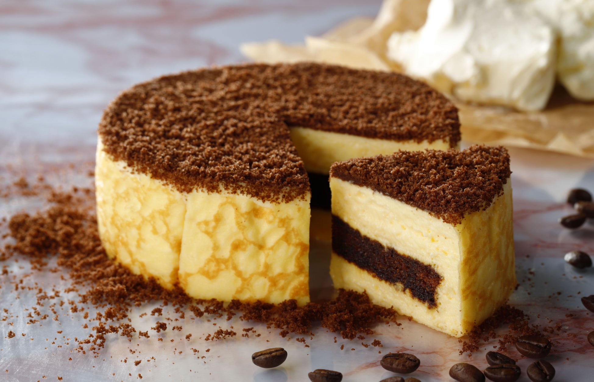 コーヒーシロップを染み込ませたココアスポンジ生地に、北海道産マスカルポーネとフランス産クリームチーズを使用 したティラミスクリームを重ね合わせ、 コーヒーパウダーと一緒にココアスポンジクラムをトッピングした、口どけのよい季節限定ケーキです。