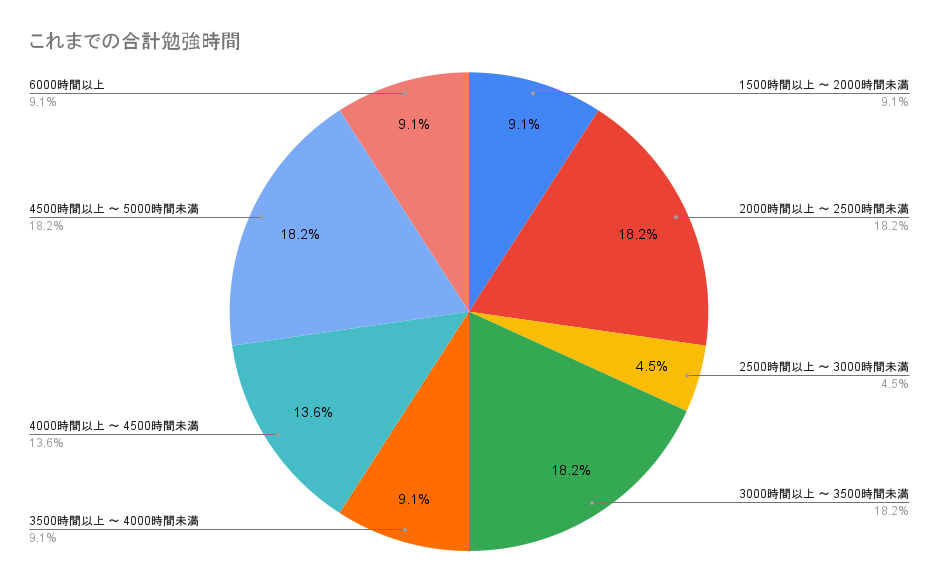 最も多かった回答は、勉強時間が2000時間以上〜2500時間未満・3000時間以上〜3500時間未満・4500時間以上〜5000時間未満の18.18%、年代は30代の35.06%でした。