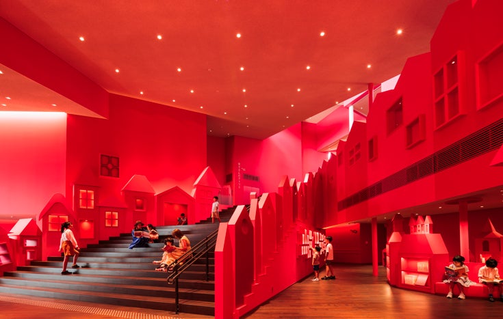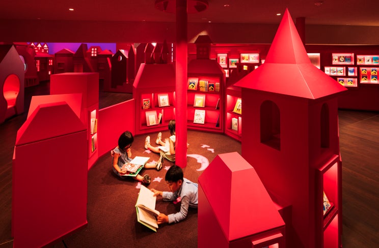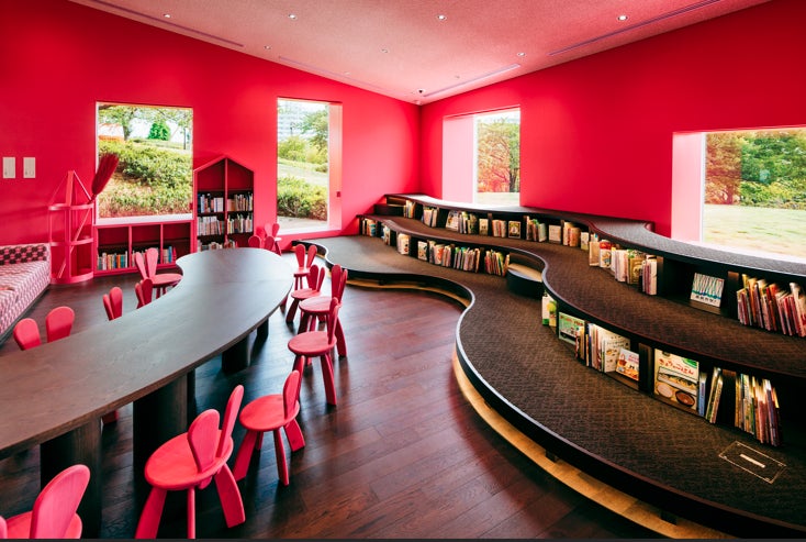 なぎさ公園の丘に建つ隈研吾氏の設計による純白の建物の中には、『魔女の宅急便』の舞台となったいちご色の「コリコの町」が広がり、壁一面に映し出されるプロジェクションマッピングや4面映像の「黒猫シアター」など、楽しい仕掛けがあふれています。「おうち形」の本棚に囲まれたライブラリーには、角野栄子さんの著作はもちろんのこと、栄子さんが自ら選んだ世界の児童書や絵本が、子どもたちの自主性を活かすべく敢えてあまり分類せずに配架されており、子どもたちは自由に本を選び、好きな場所で、お気に入りの本を読むことができます。