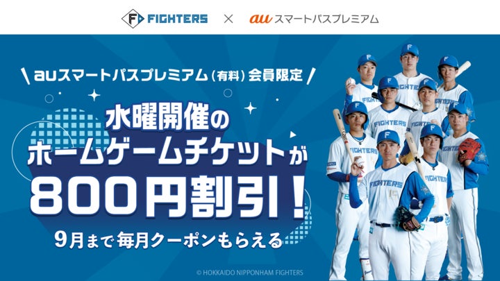 内容 :auスマートパスプレミアム会員限定で、北海道日本ハムファイターズの水曜ホームゲームチケットが800円割引になるクーポンを毎月提供します。