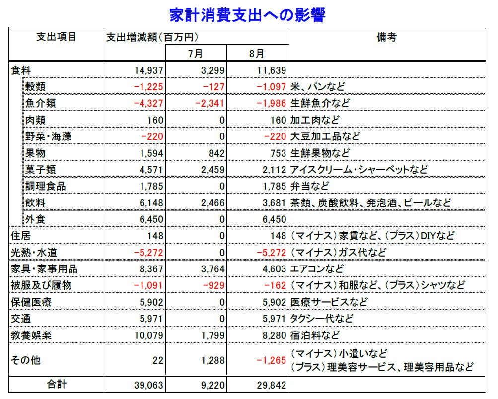 支出項目別にみると、「食料」は、主食となる穀類や魚介類への支出が大きく減少した一方で、弁当など火を使わない調理食品は増加した。また、飲料は、炭酸飲料(約14億円増)や茶飲料(約11億円増)、発泡酒等(約9億円増)、ビール(約7億円増)などを含め、大幅に増加した。さらに、アイスクリーム・シャーベットなどが大幅に増加した菓子類など、「食料」は約149億3,700万円の増加となった。「家具・家事用品」はエアコンなどの冷房器具への支出が増加したほか、「保健医療」は熱中症対策など医療サービスを中心に支出が増加したと見込まれる。また、宿泊料を含む「教養娯楽」が約100億7,900万円増加したとみられる。