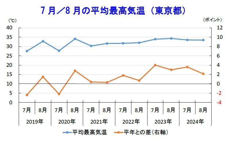 2024年の夏は、平均気温が過去最高を更新する見込みとなっている。気象庁によると、東京都における2024年7月の最高気温は平均33.5℃で、平年値(1991年から2020年の30年間の平均値)より3.6℃高かった。さらに8月は同33.4℃と平年より2.1℃高くなると見込まれる(気象庁による8月22日14時30分発表の2週間気温予報を含む)。また、東京都では7月と8月の猛暑日が合計19日に及んでいる(同上)。