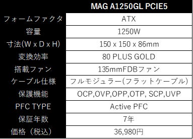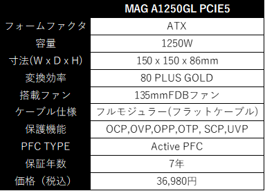 製品URL:https://jp.msi.com/Power-Supply/MAG-A1250GL-PCIE5
