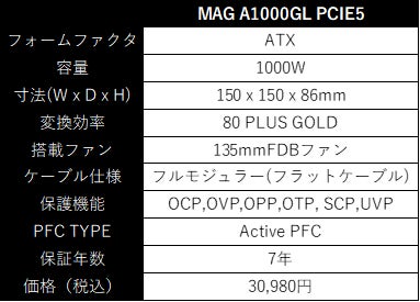 製品URL:https://jp.msi.com/Power-Supply/MAG-A1000GL-PCIE5